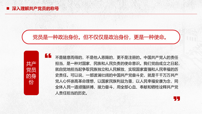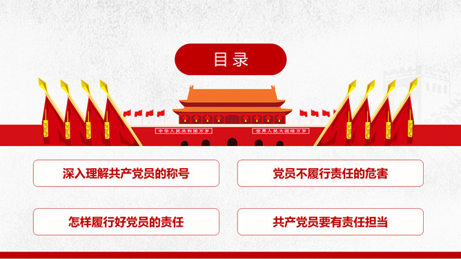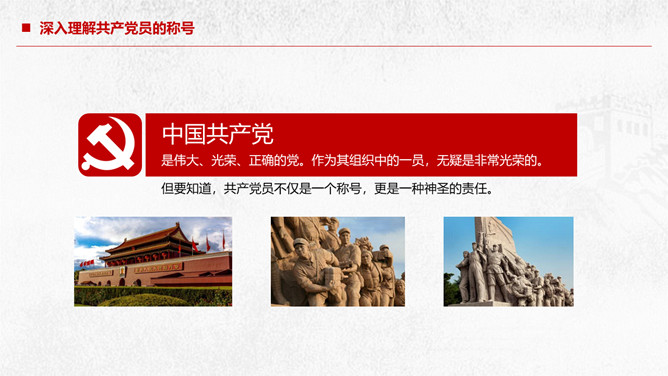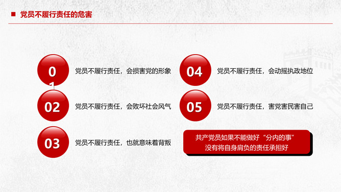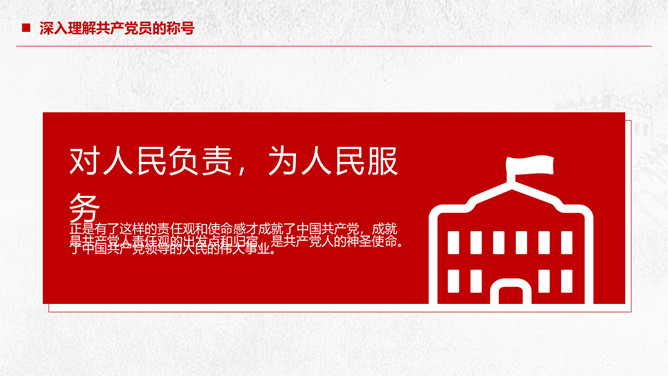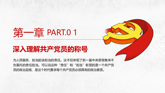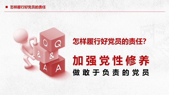 党员责任争做合格党员建功新时代PPT模板。深入理解共产党员的称号、党员不履行责任的危害、怎样履行好党员的责任、共产党员要有责任担当。
