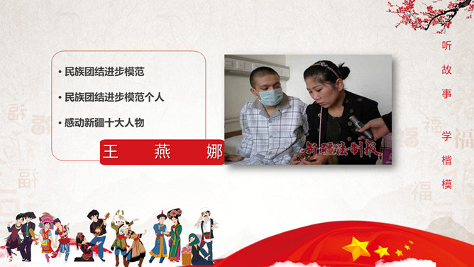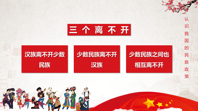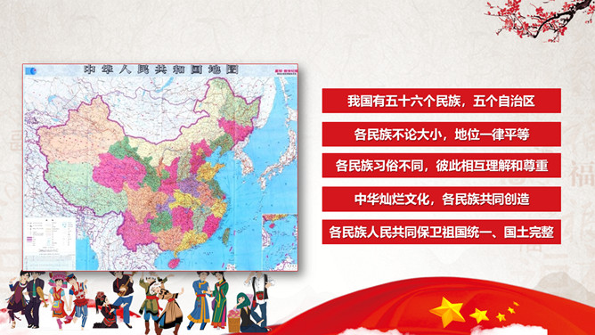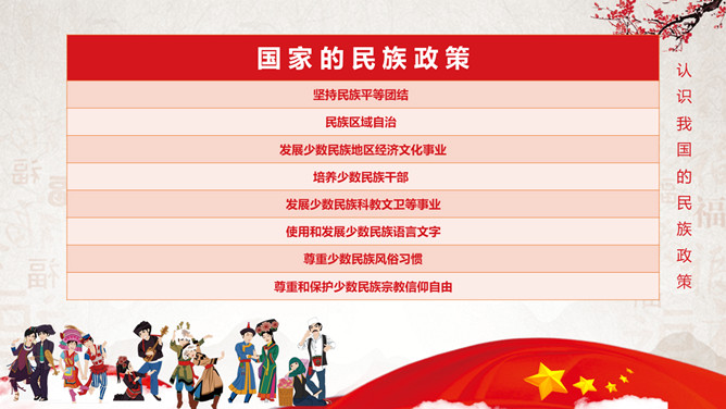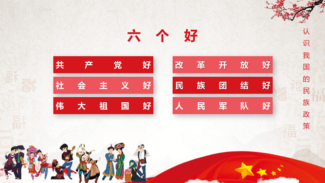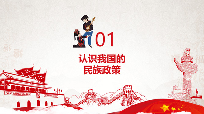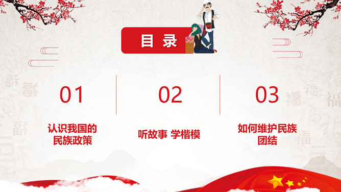 民族大团结共筑中国梦民族团结教育PPT模板。目录:认识我国的民族政策、听故事学楷模、如何维护民族团结。