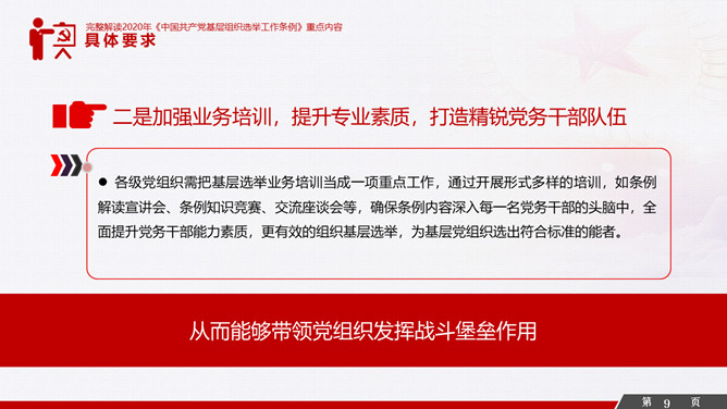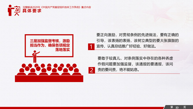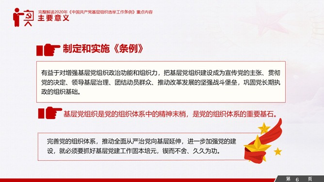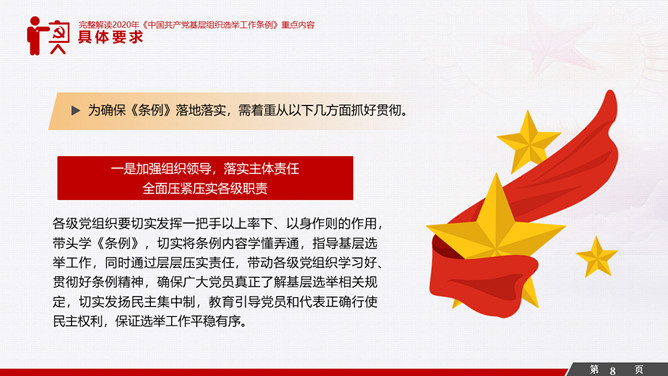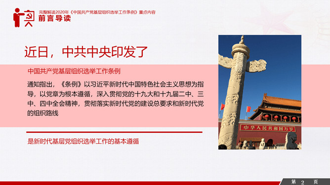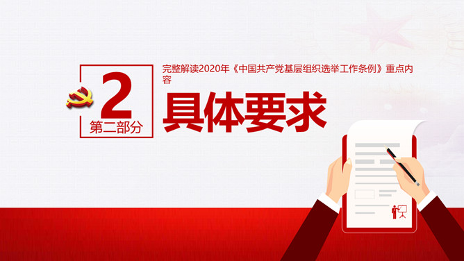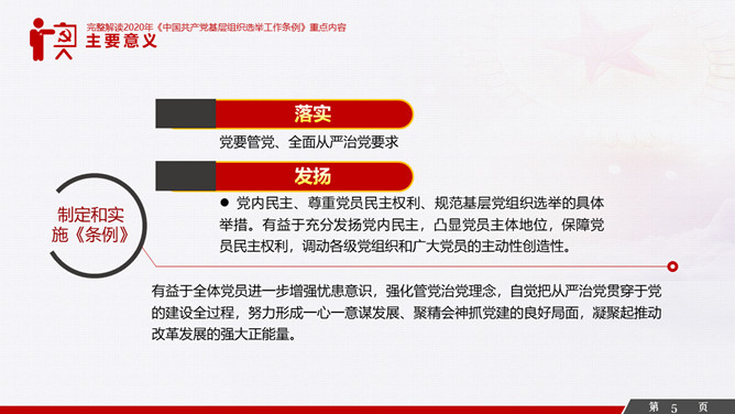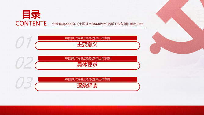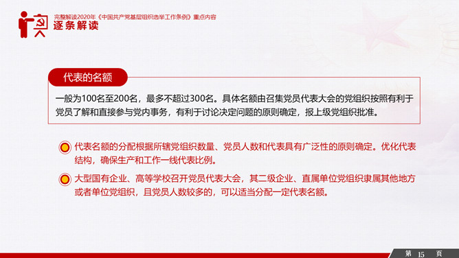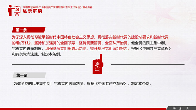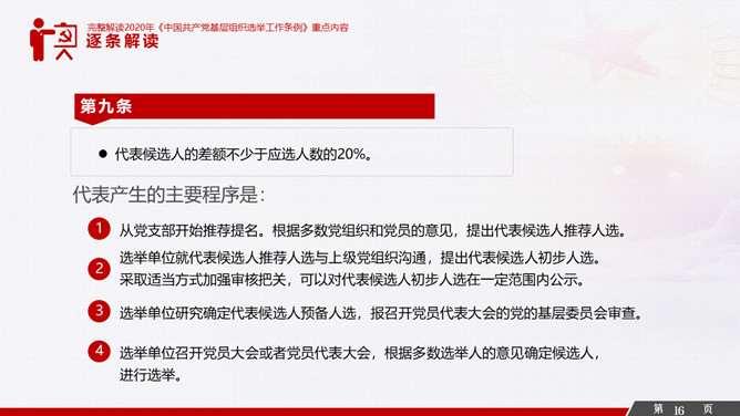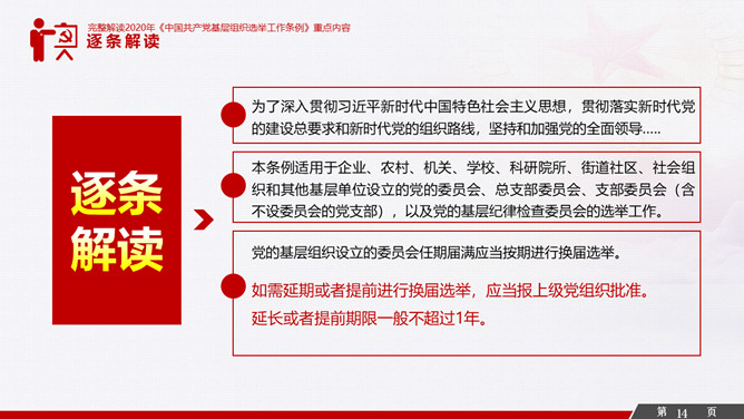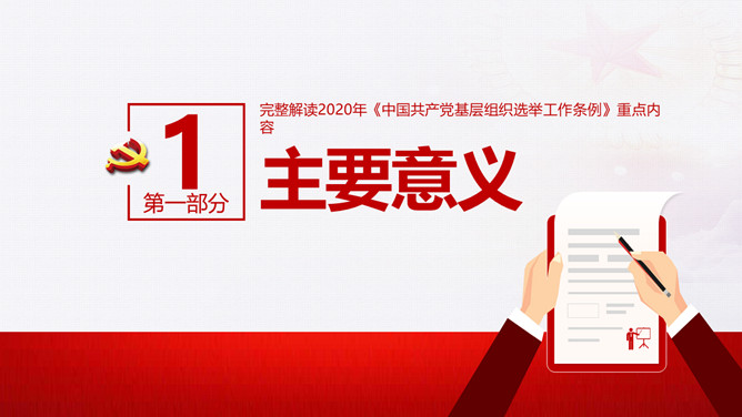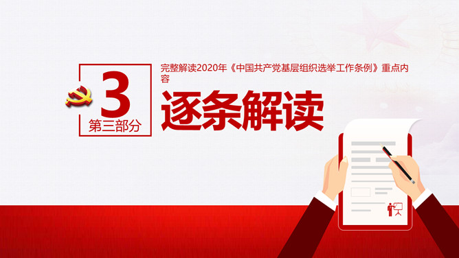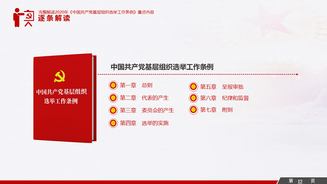 解读基层组织选举工作条例PPT模板。完整解读《中国共产党基层组织选举工作条例》重点内容,包括主要意义、具体要求、逐条解读等主要内容。
