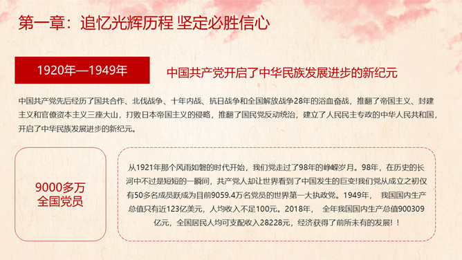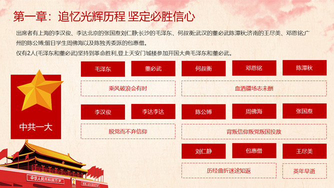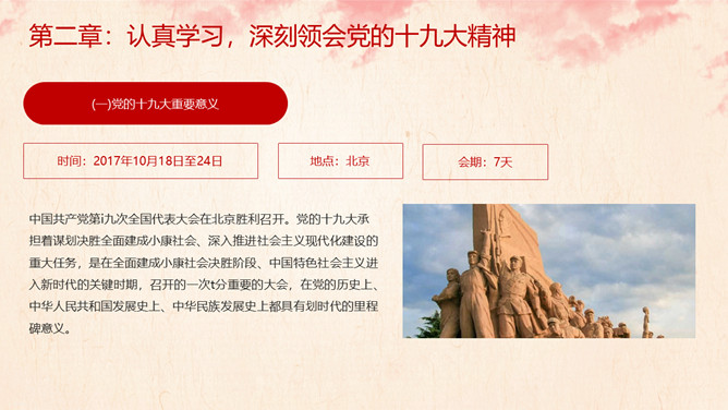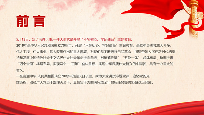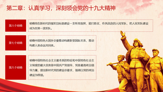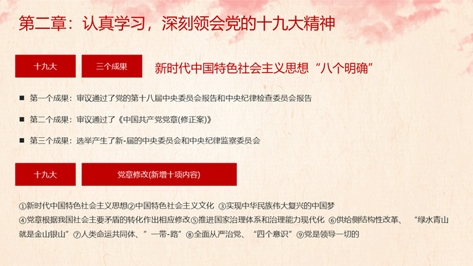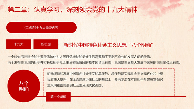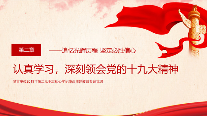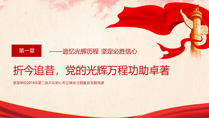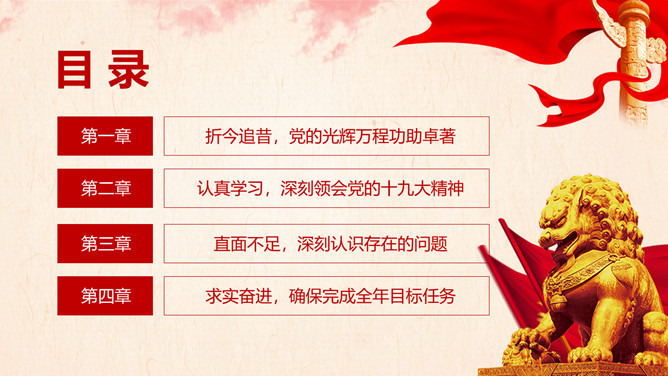 凝聚力量实现目标任务PPT模板。目录:折今追昔,党的光辉万程功助卓著。认真学习,深刻领会党的十九大精神。直面不足,深刻认识存在的问题。求实奋进,确保完成全年目标任务。