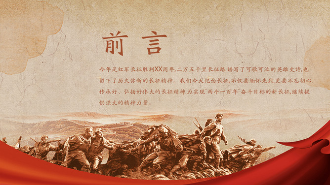 长征精神永放光芒纪念长征胜利PPT模板。我们今天纪念长征,不仅要缅怀先烈,更要不忘初心,传承好、弘扬好伟大的长征精神,为实现“两个一百年”奋斗目标的新长征,继续提供强大的精神力量。