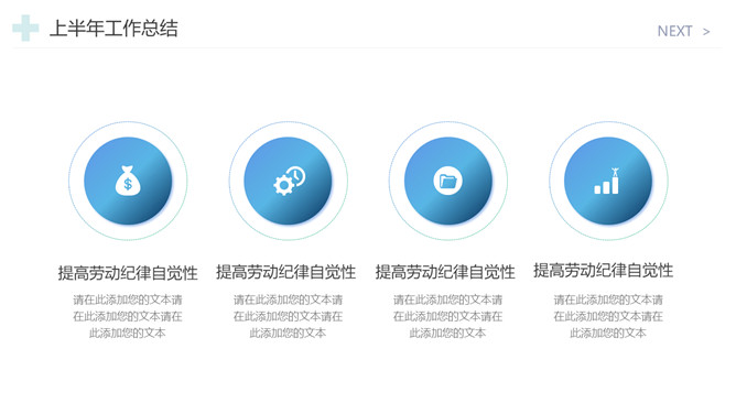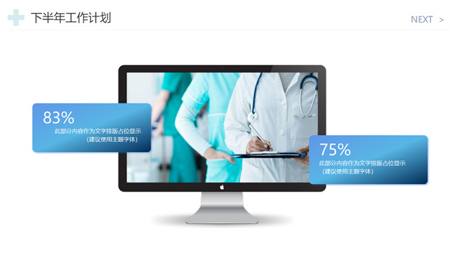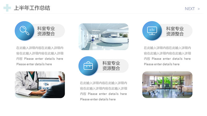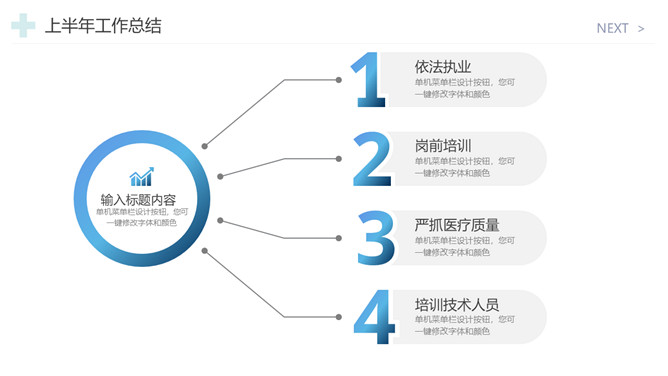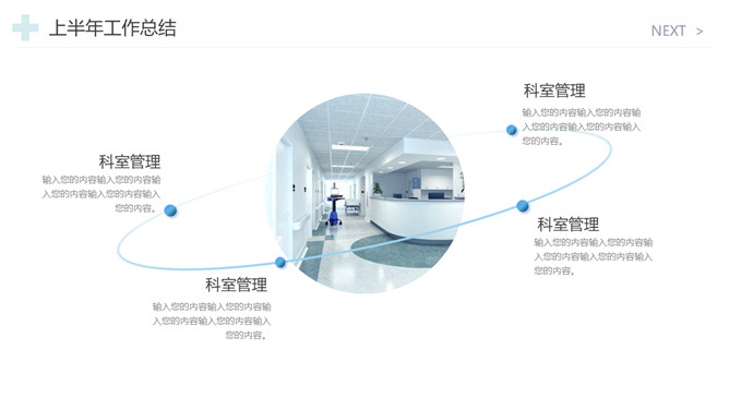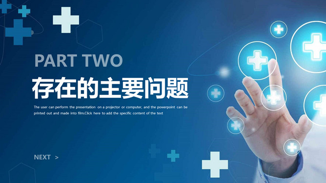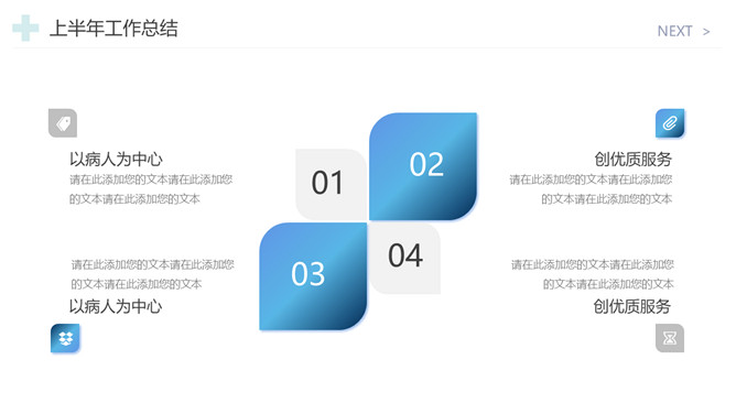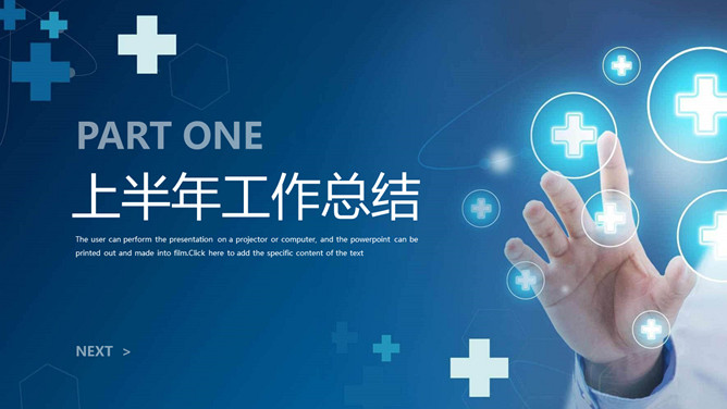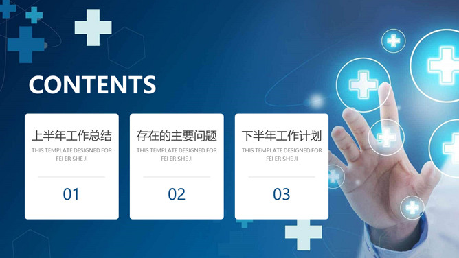 医院工作总结报告PPT模板。一套医院年终工作总结汇报幻灯片模板,简约设计,蓝色主色调,十字图标装饰。