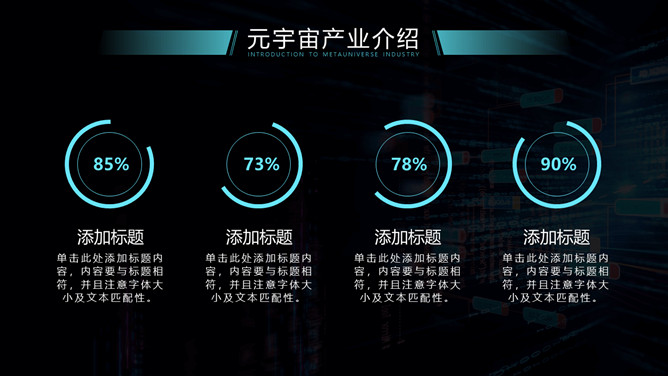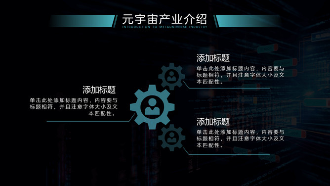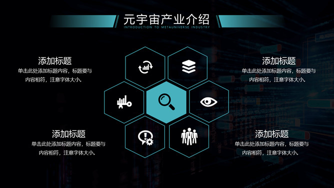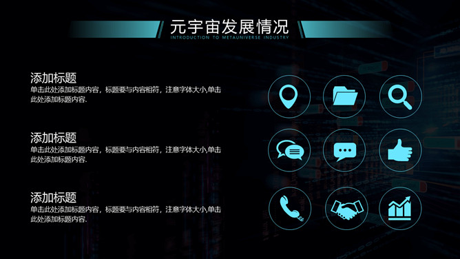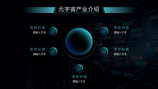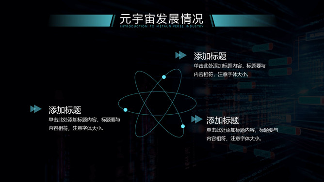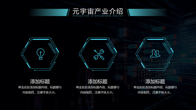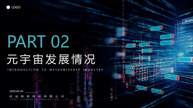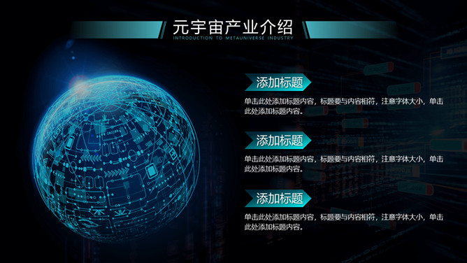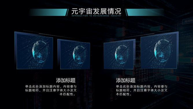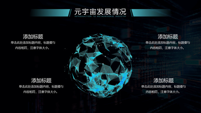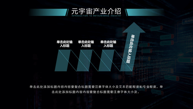 炫酷科技风元宇宙主题PPT模板。一套元宇宙主题幻灯片模板,炫酷科技风设计,介绍相关产业目前情况和未来发展。