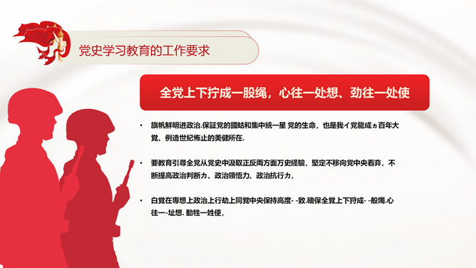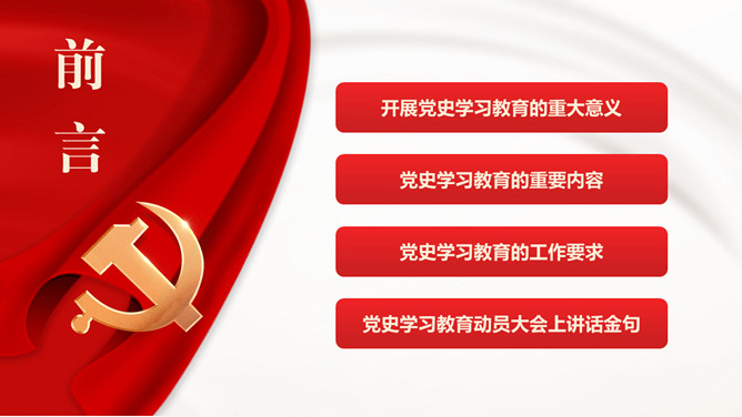 党史学习教育动员大会PPT模板。目录:开展党史学习教育的重大意义、重要内容、工作要求、动员大会上讲话金句。