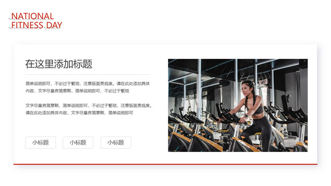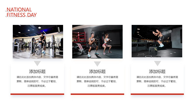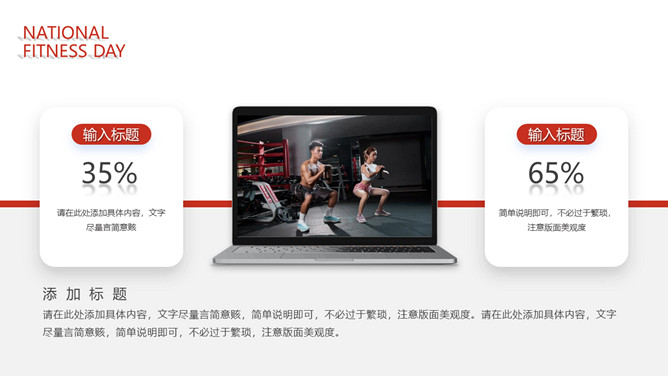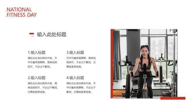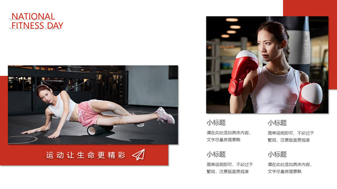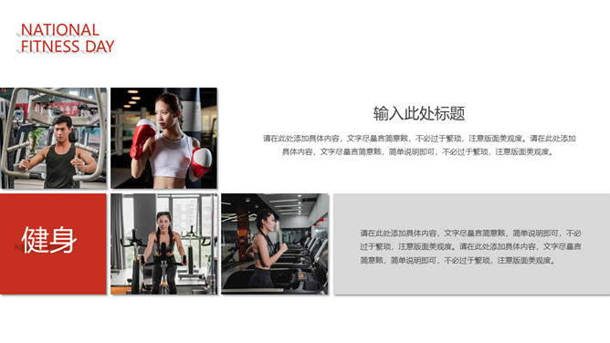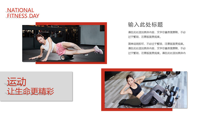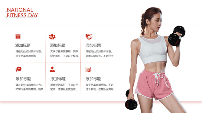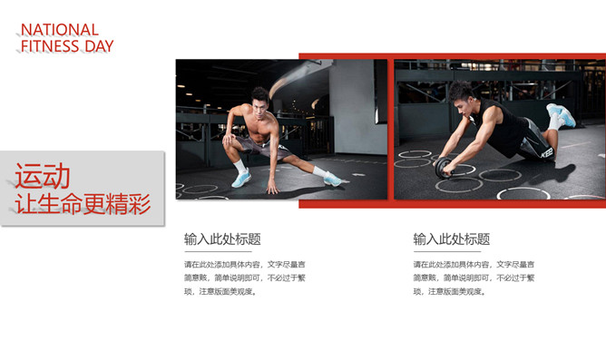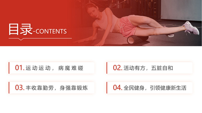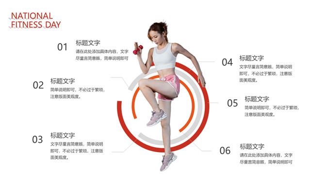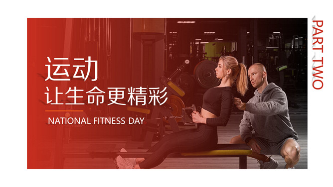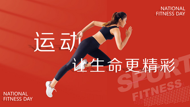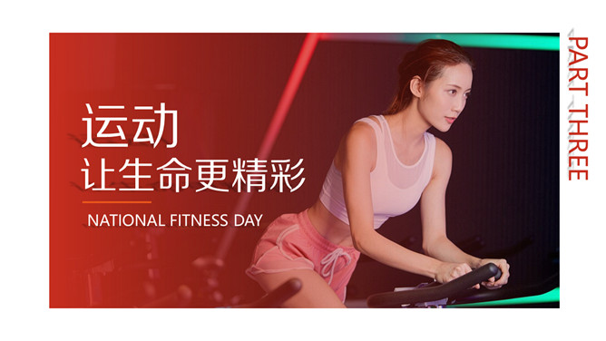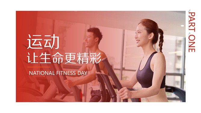 体育运动全民健身日PPT模板。一套全民健身日主题幻灯片模板,热情活力橙红主色调,适合体育运动相关内容。