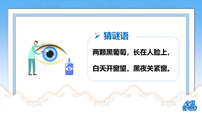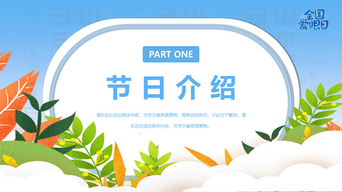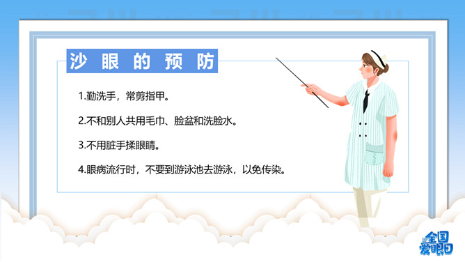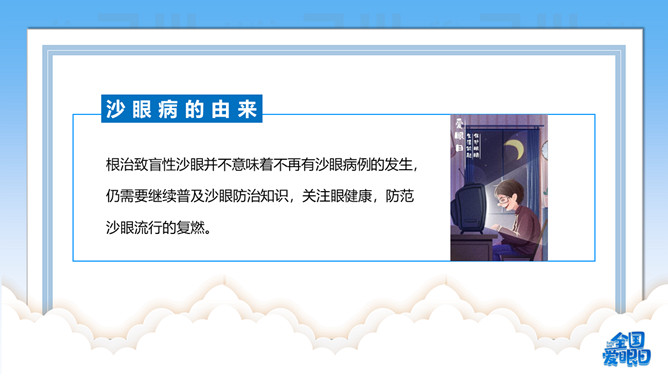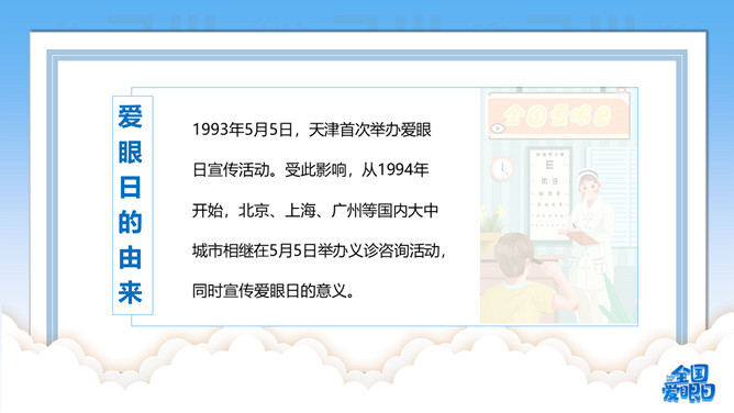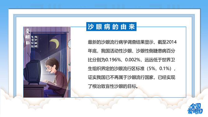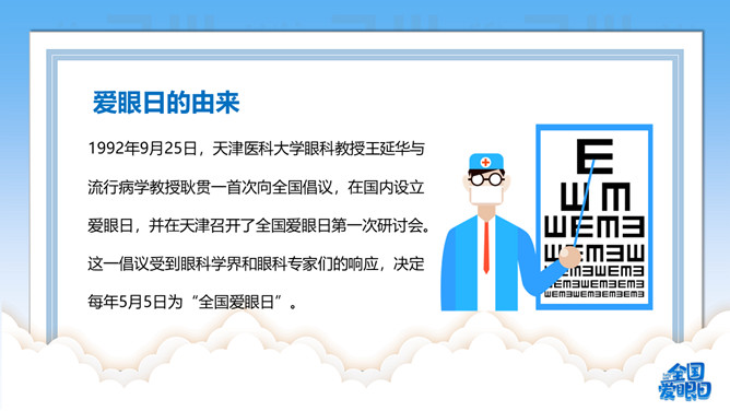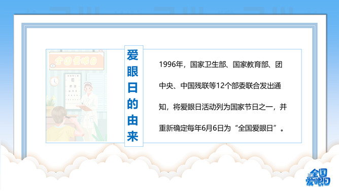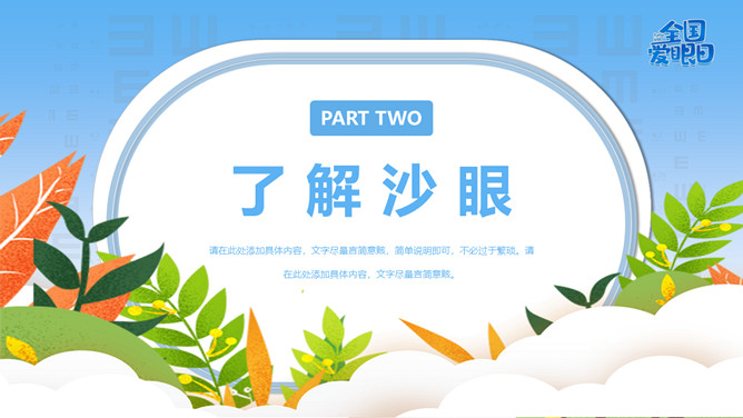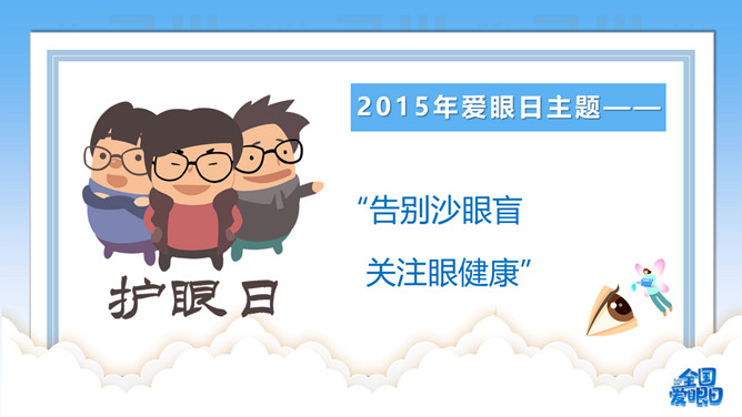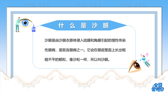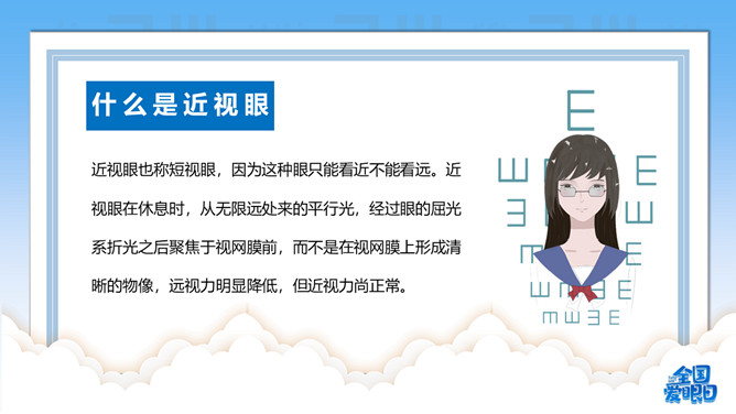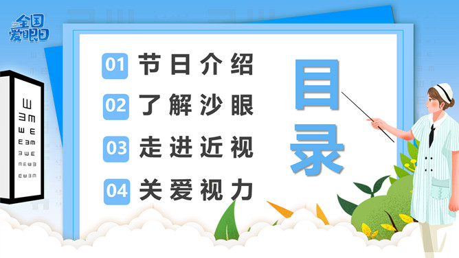 保护眼睛全国爱眼日介绍PPT模板。一套爱眼日主题幻灯片模板,目录:节日介绍、了解沙眼、走进近视、关爱视力。