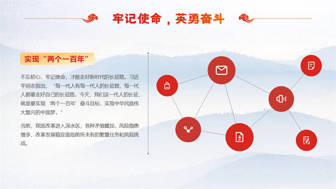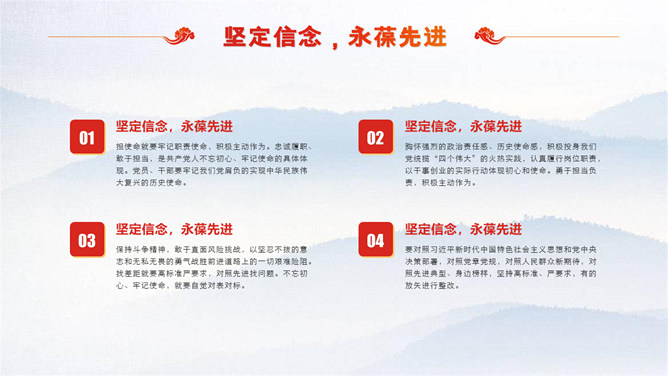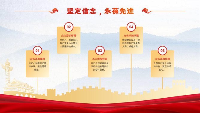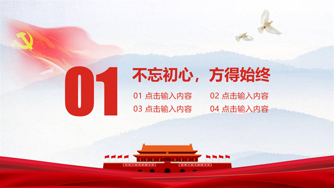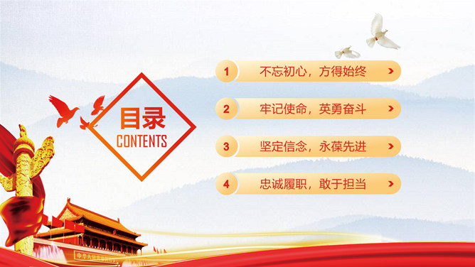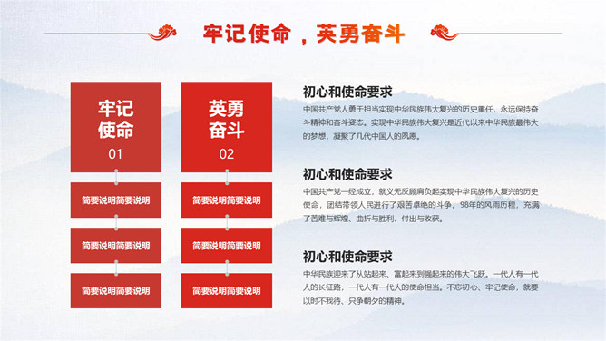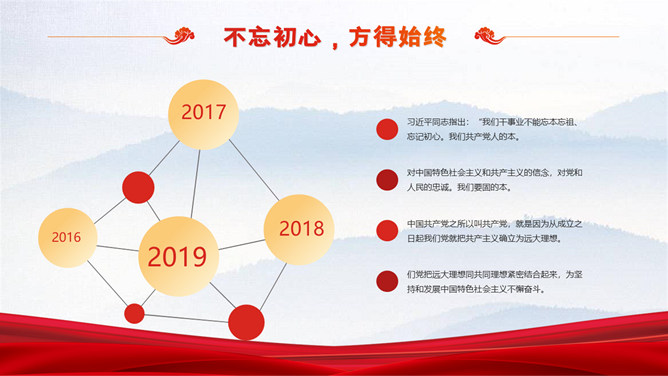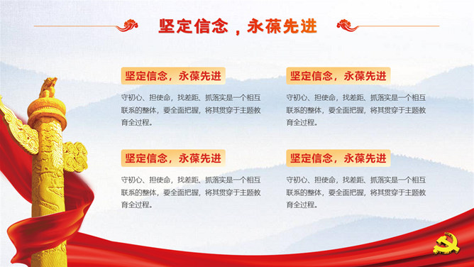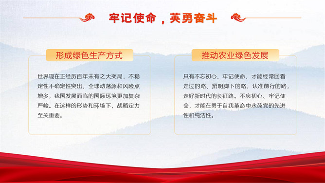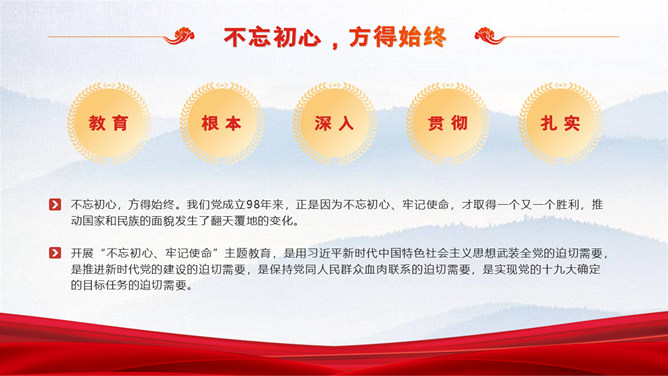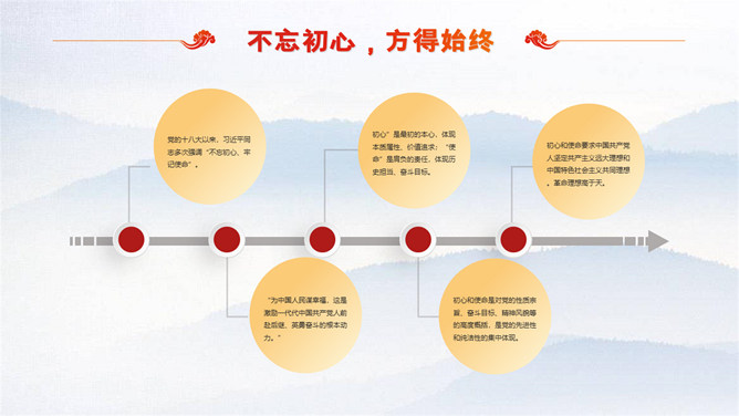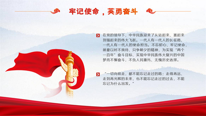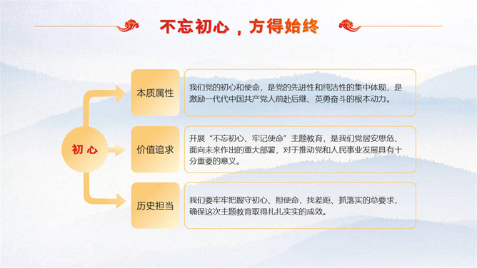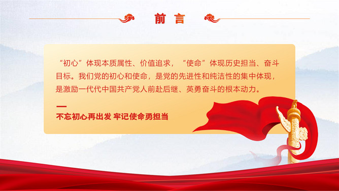 不忘初心勇担当党课课件PPT模板。“初心”体现本质属性、价值追求,“使命”体现历史担当、奋斗目标。我们党的初心和使命,是党的先进性和纯洁性的集中体现,是激励一代代中国共产党人前赴后继、英勇奋斗的根本动力。