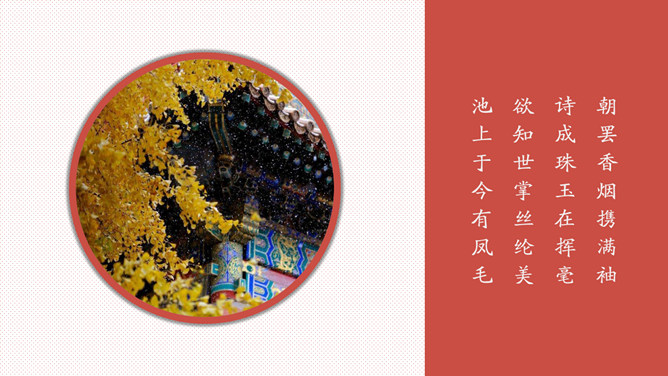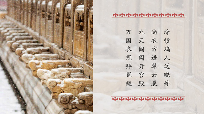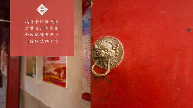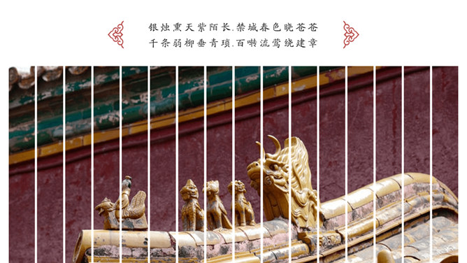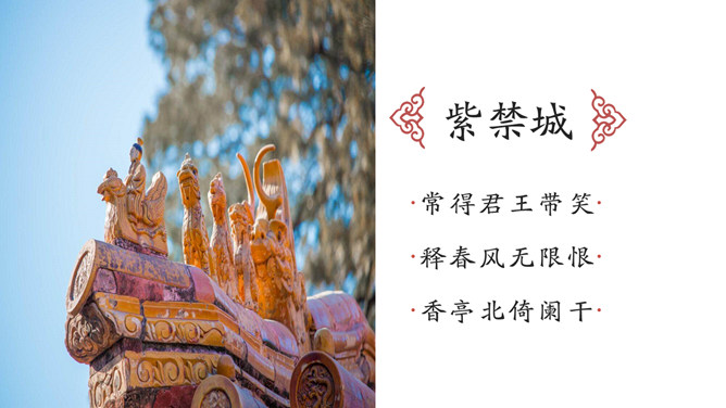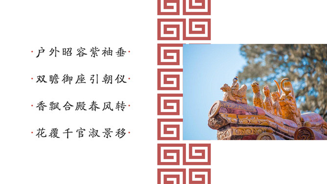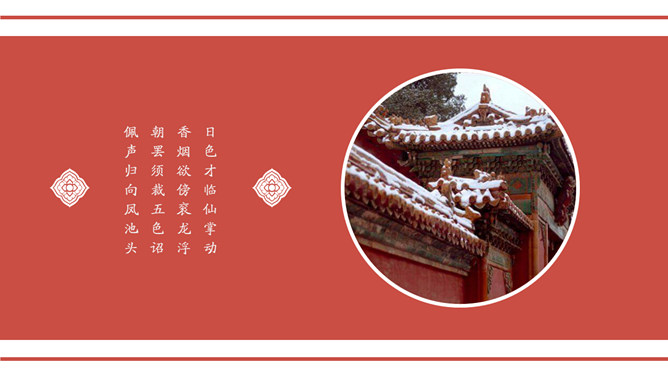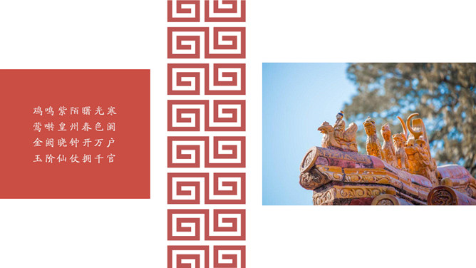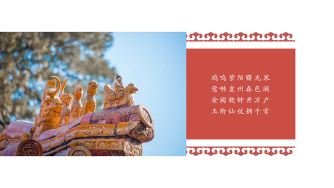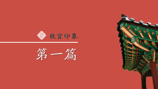 故宫印象故宫旅游相册PPT模板。一套故宫旅游照片相册幻灯片模板,大气砖红主色调,多种图文排版方式。