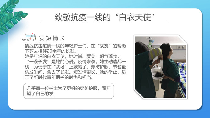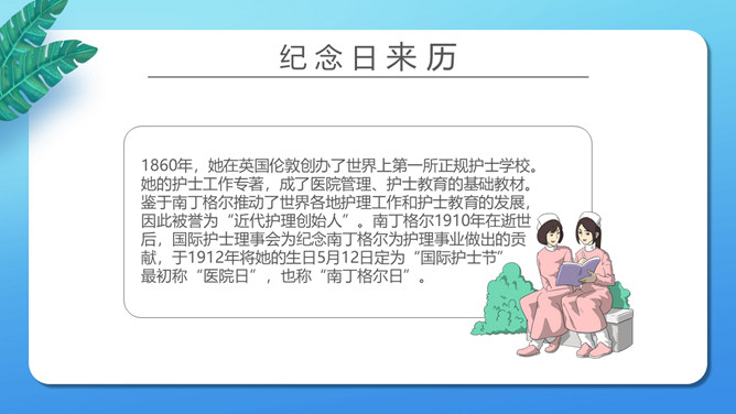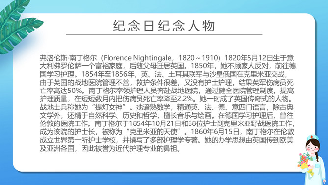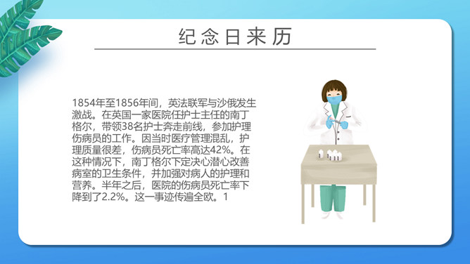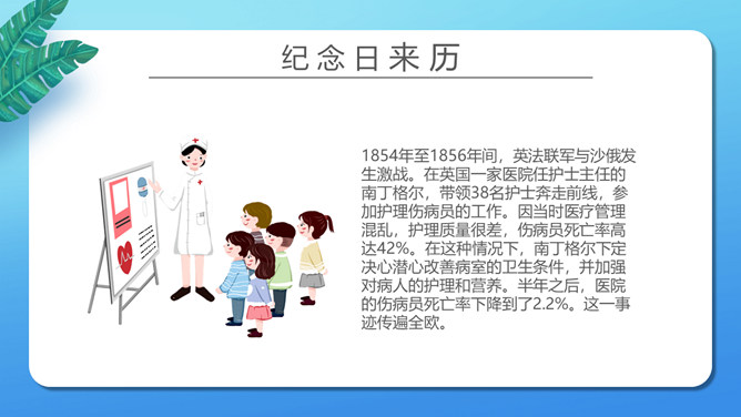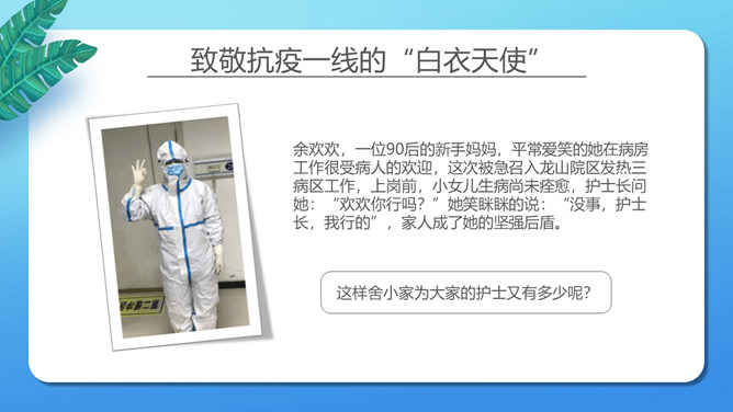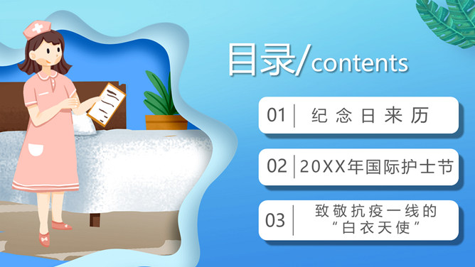 致敬平凡国际护士节PPT模板。矢量卡通设计风格,介绍了纪念日的来历,并向抗 疫一线的“ 白衣天使 ”致敬。