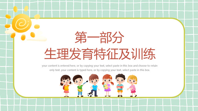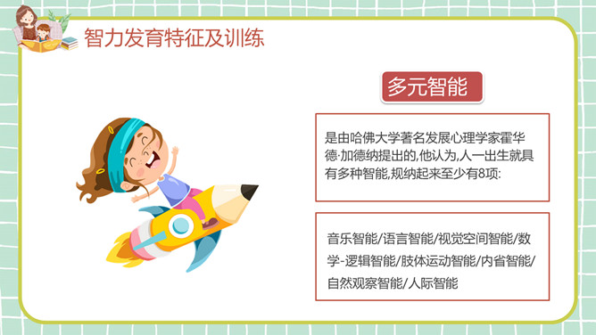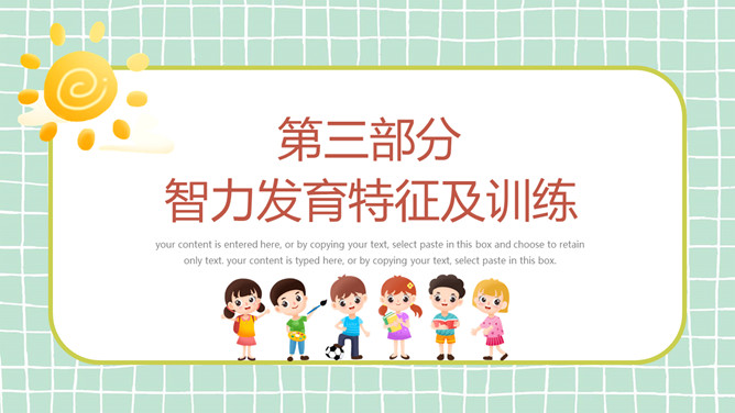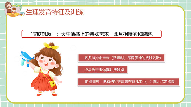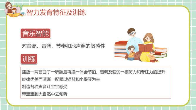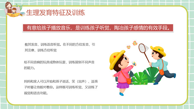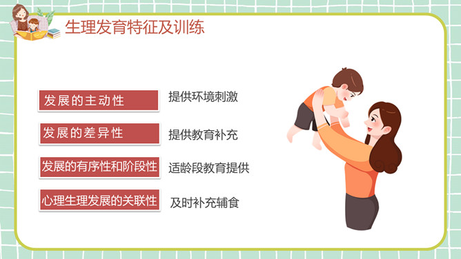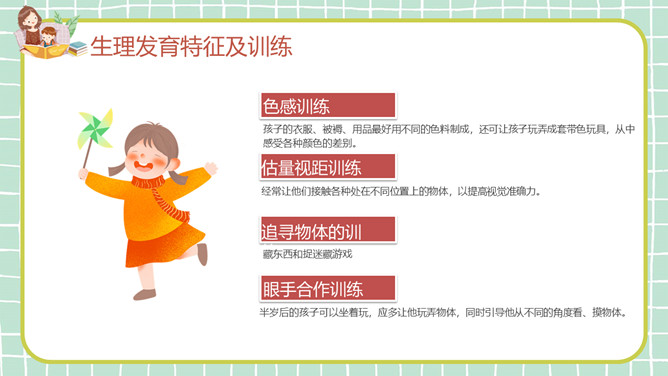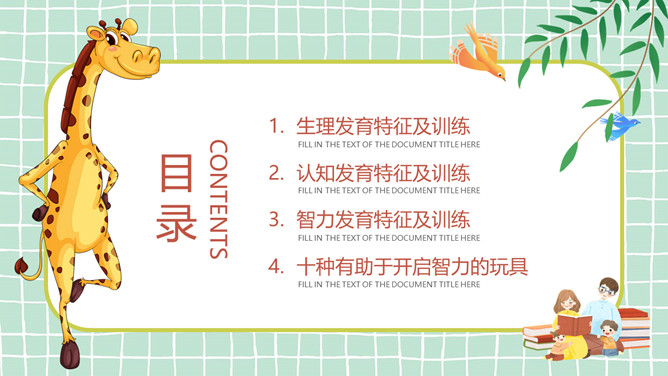 幼儿早教发育知识PPT模板。目录:生理发育特征及训练、认知发育特征及训练、智力发育特征及训练、十种有助于开启智力的玩具。