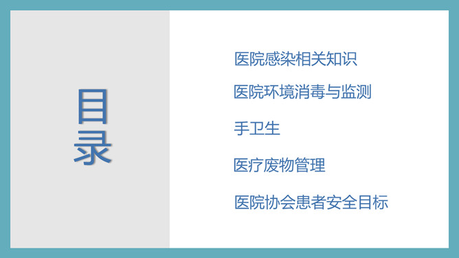 医院感染控制知识培训PPT模板。目录:医院感染相关知识、医院环境消毒与监测、手卫生、医疗废物管理、医院协会患者安全目标。