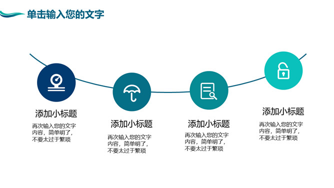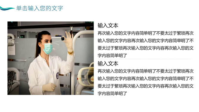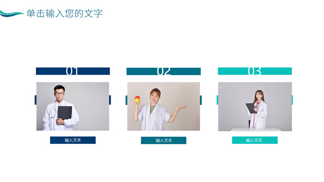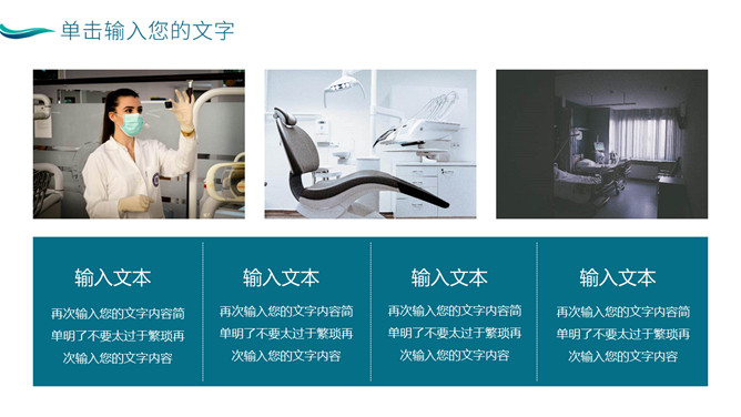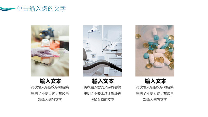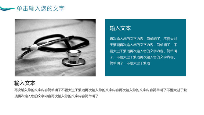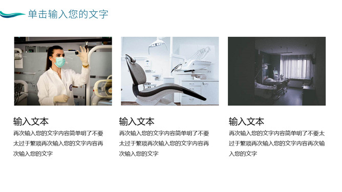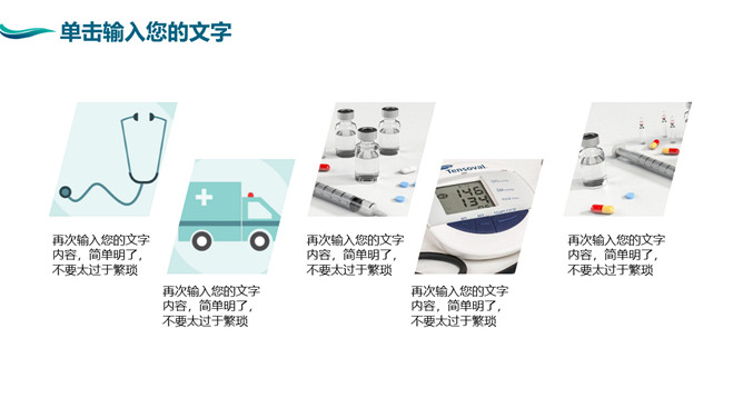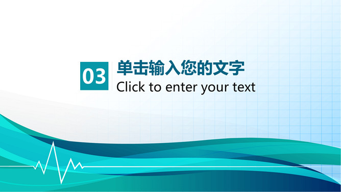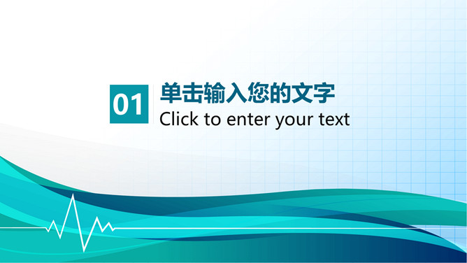 简约医疗医学通用PPT模板。一套医学医疗通用幻灯片模板,绿色主色调,波浪形状和心电图曲线装饰。