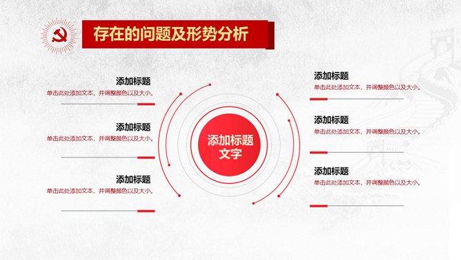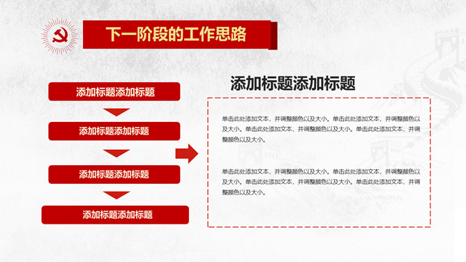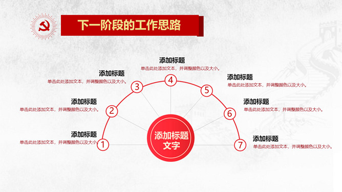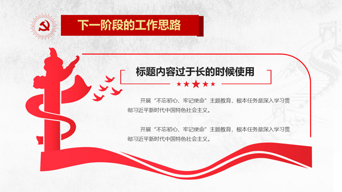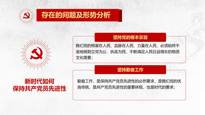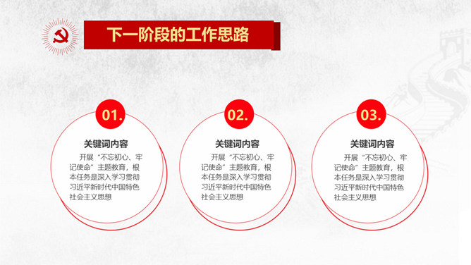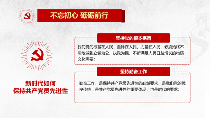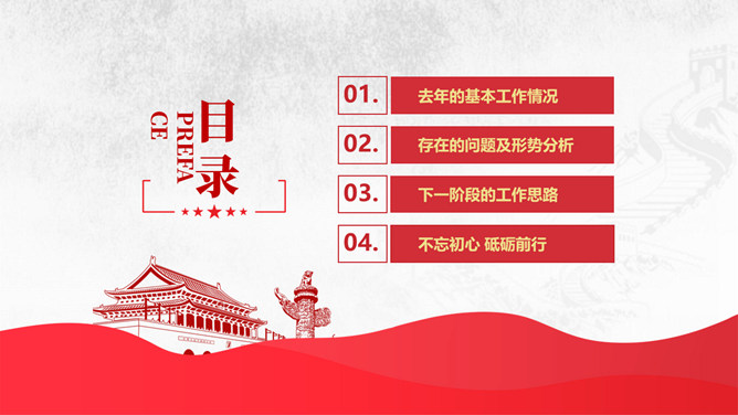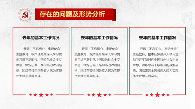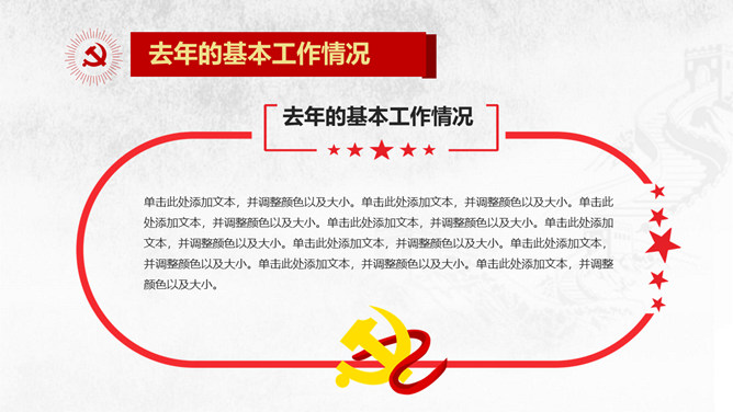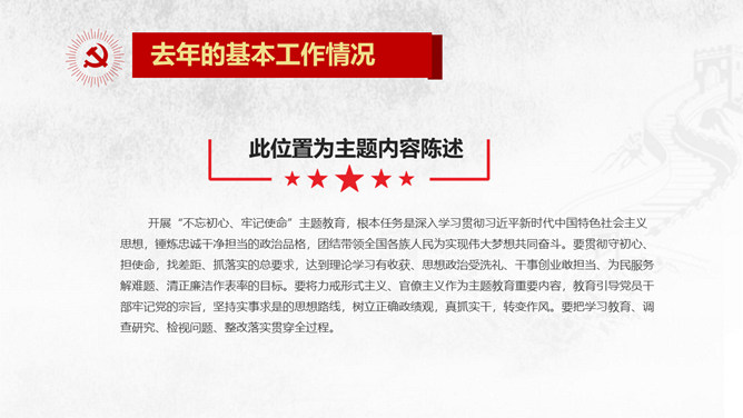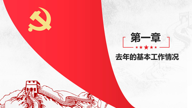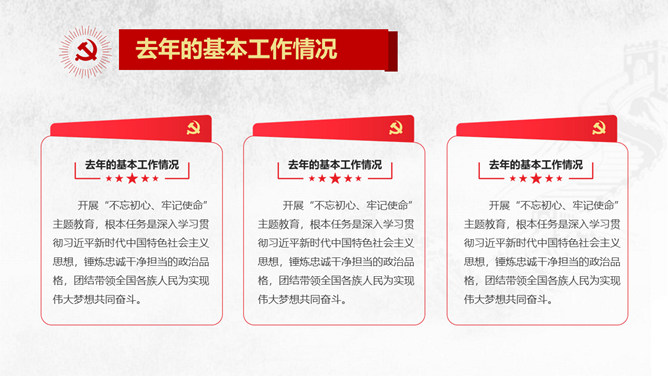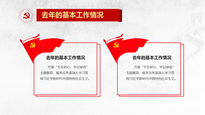 党委党支部党建党务工作年终总结PPT模板。包括去年的基本工作情况、存在的问题及形势分析、下一阶段的工作思路、不忘初心 砥砺前行等内容。