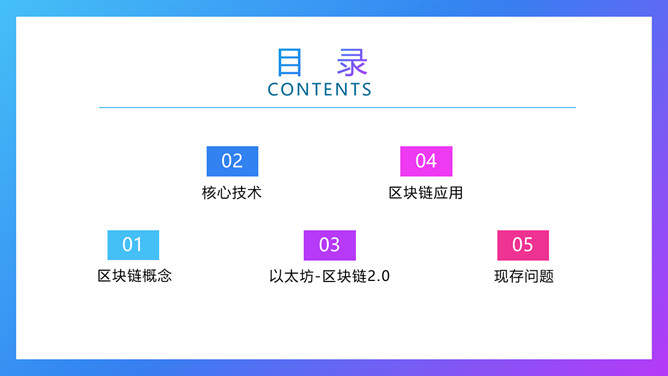区块链技术与应用PPT模板。目录:区块链概念、核心技术、以太坊-区块链2.0、区块链应用、现存问题。