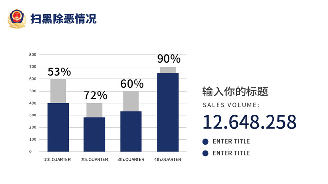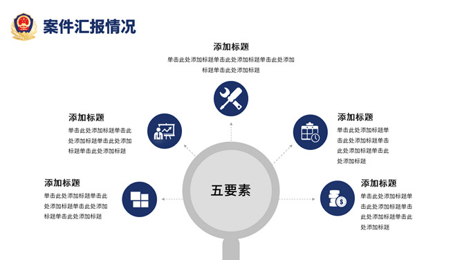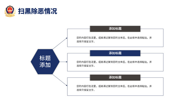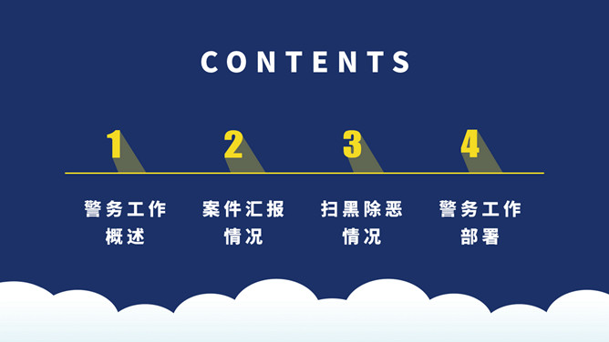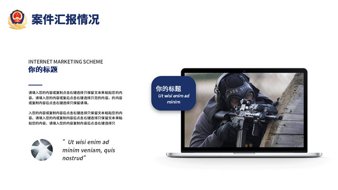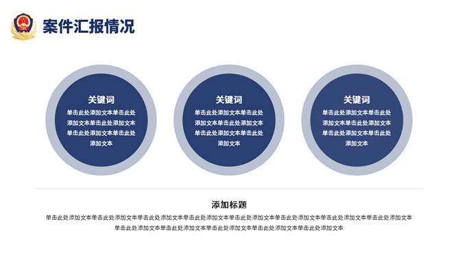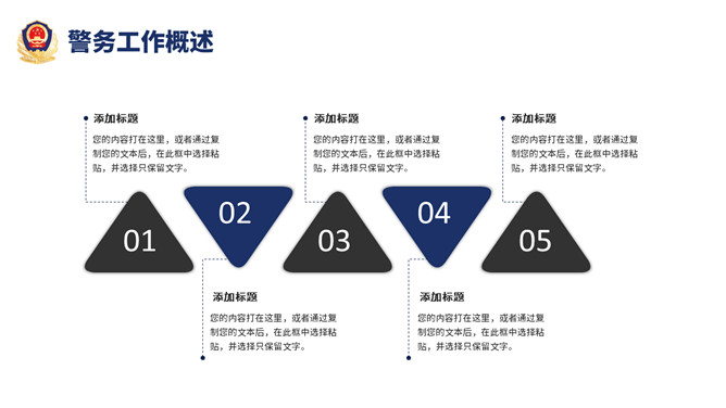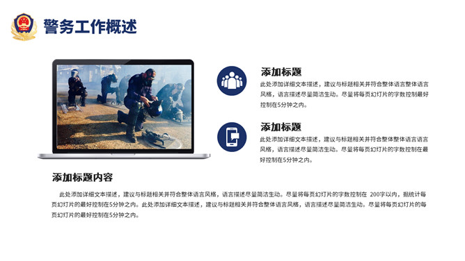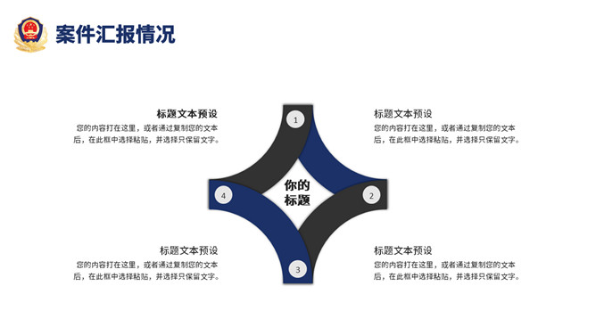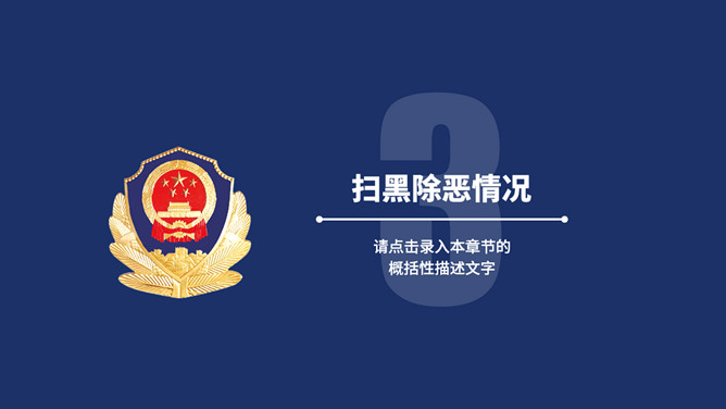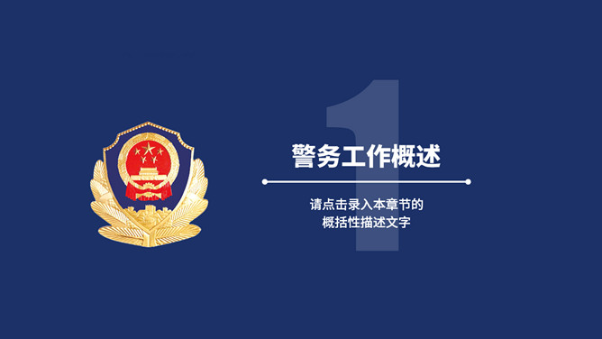 公安警察工作总结汇报PPT模板。一套警察局、派出所工作总结汇报幻灯片模板,深蓝主色调,警徽被背景。