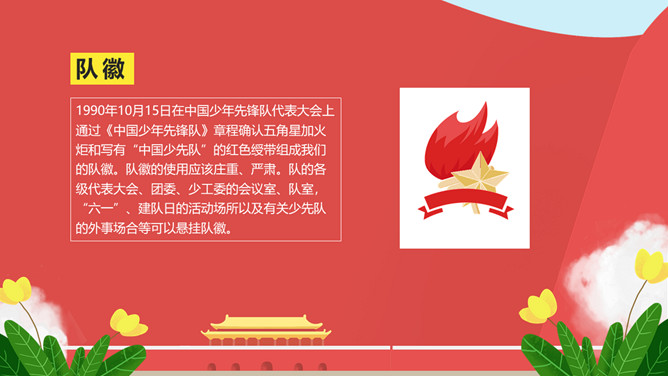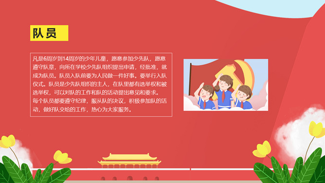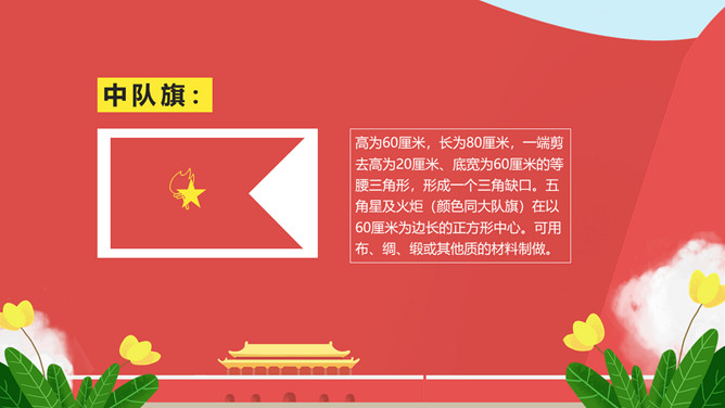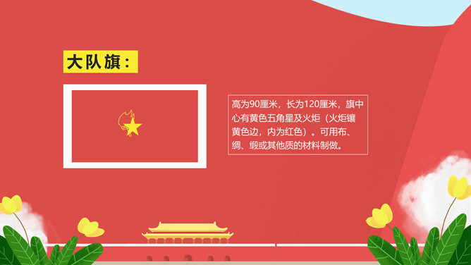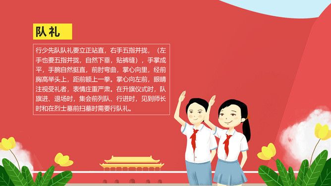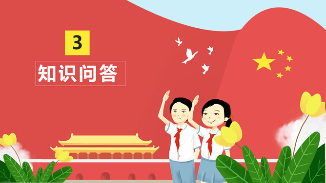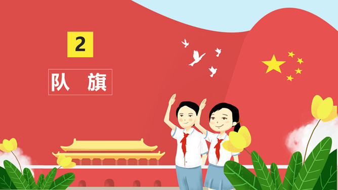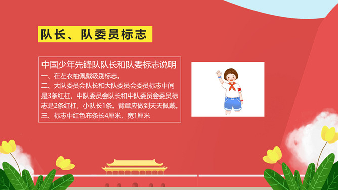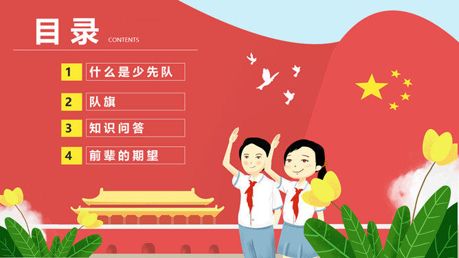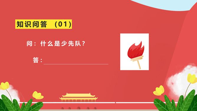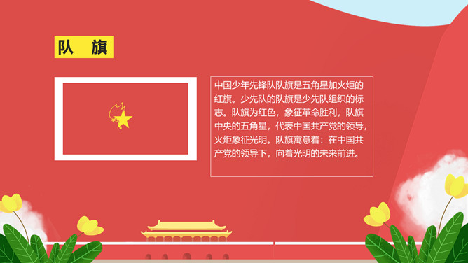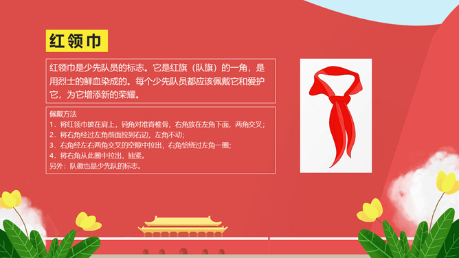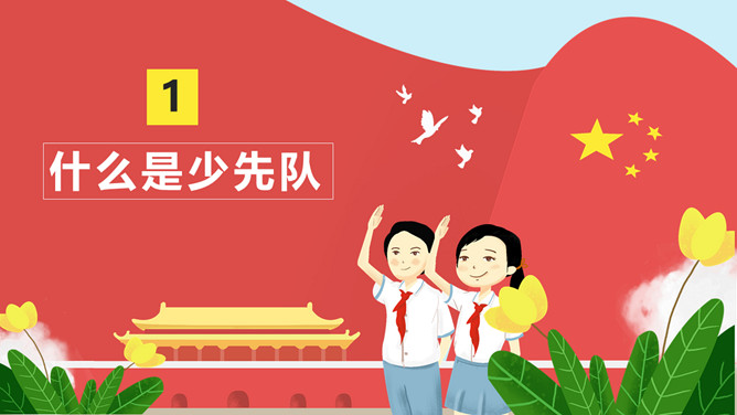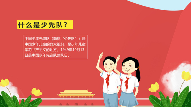 纪念少先队建队周年PPT模板。一套少先队建队周年纪念活动幻灯片模板,包括什么是少先队、队旗、知识问答、前辈的期望等环节。