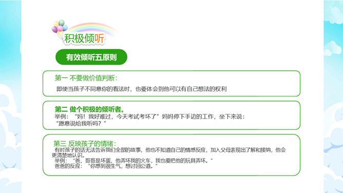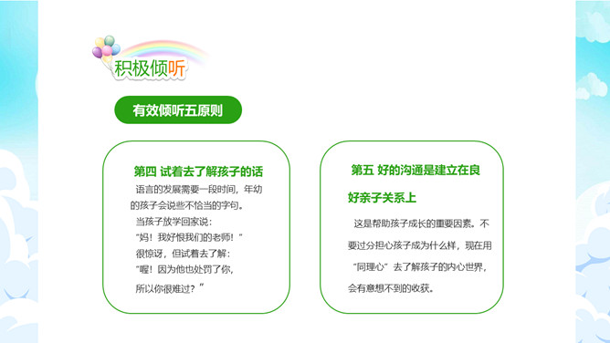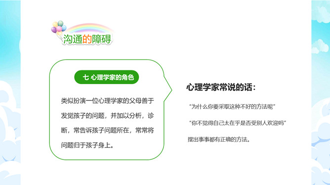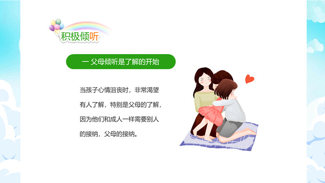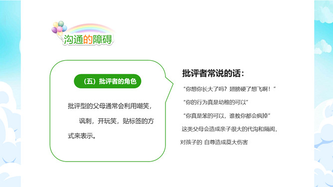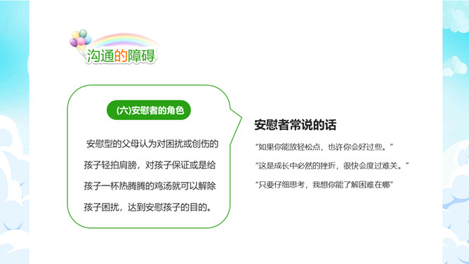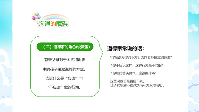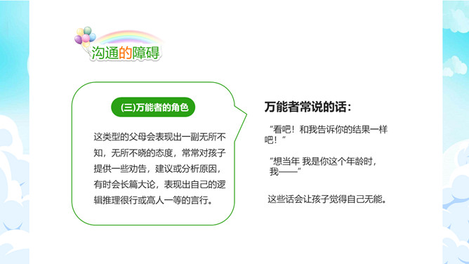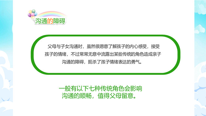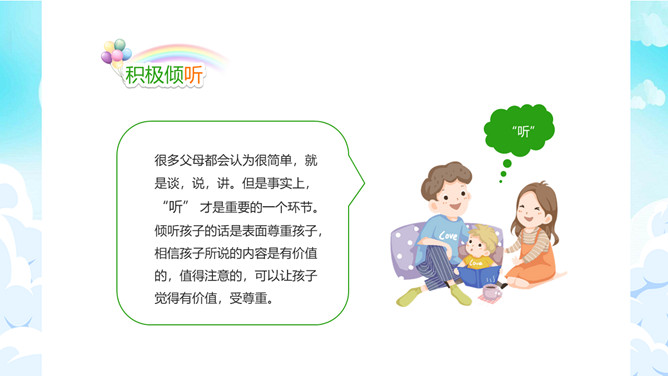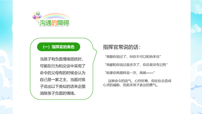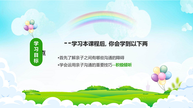 亲子沟通技巧PPT模板下载。家长该如何和孩子建立正确的沟通方式?首先了解亲子之间有哪些沟通的障碍,学会运用亲子沟通的重要技巧。