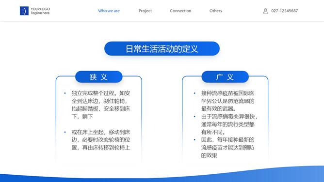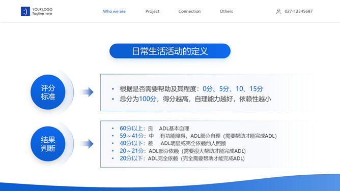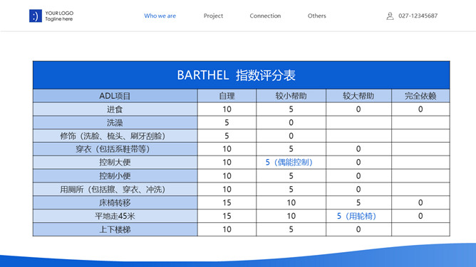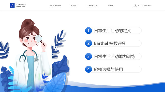 医疗保健康复护理新技术PPT模板。目录:日常生活活动的定义、Barthel 指数评分、日常生活活动能力训练、轮椅选择与使用。