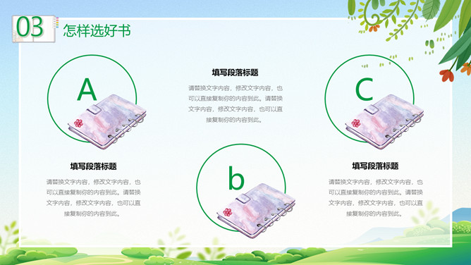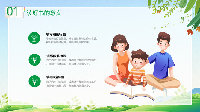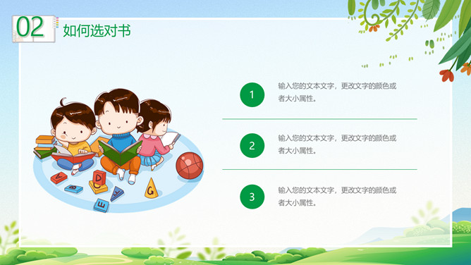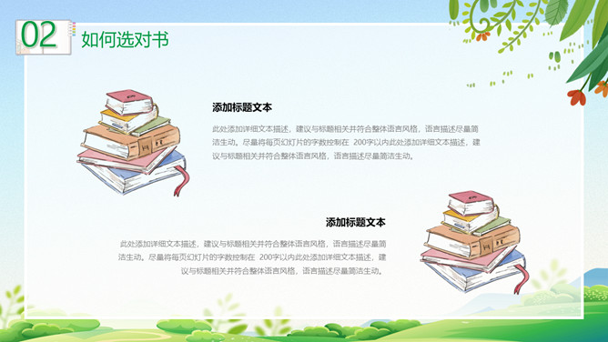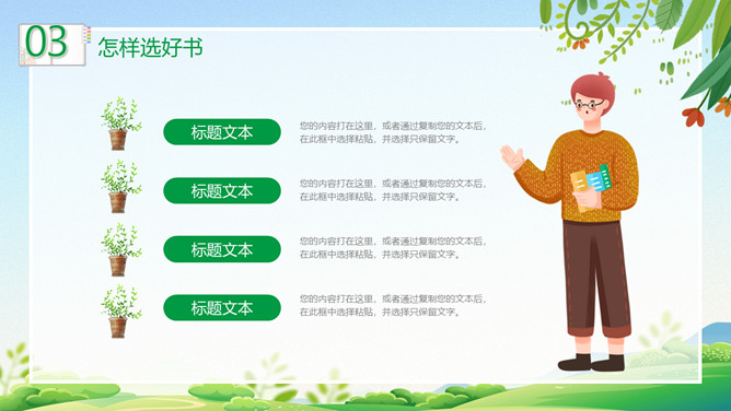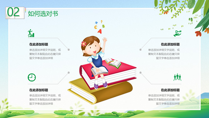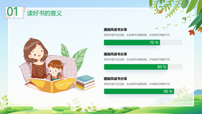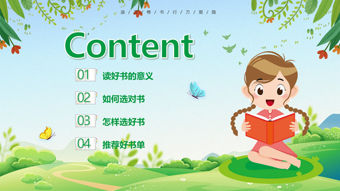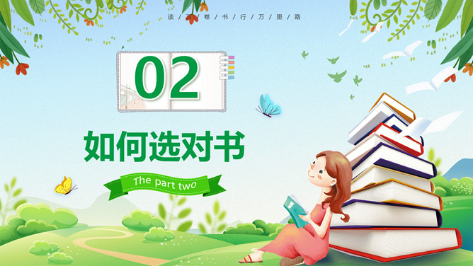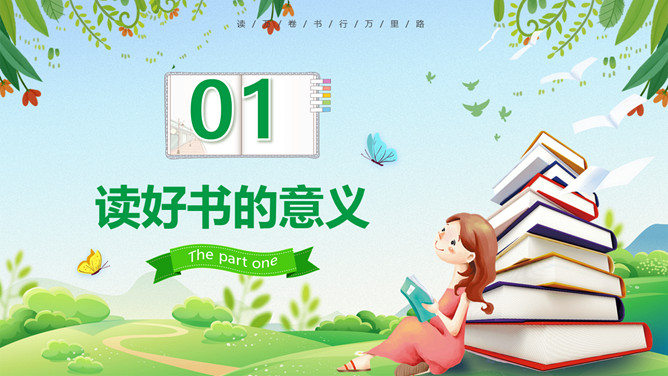 卡通插画风全民阅读PPT模板。一套全民阅读主题幻灯片模板,可爱女孩和书籍背景,插画风设计风格。