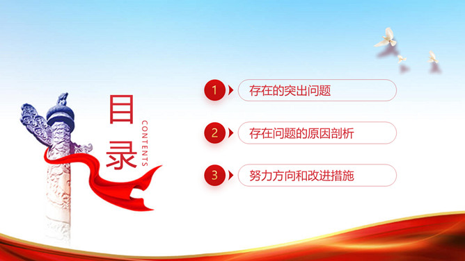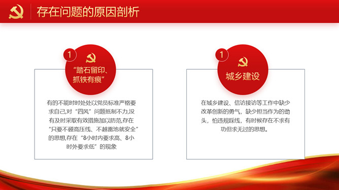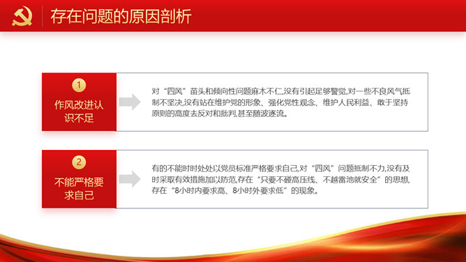 民主生活会班子个人检视剖析PPT模板。包括存在的突出问题、存在问题的原因剖析、努力方向和改进措施几部分。