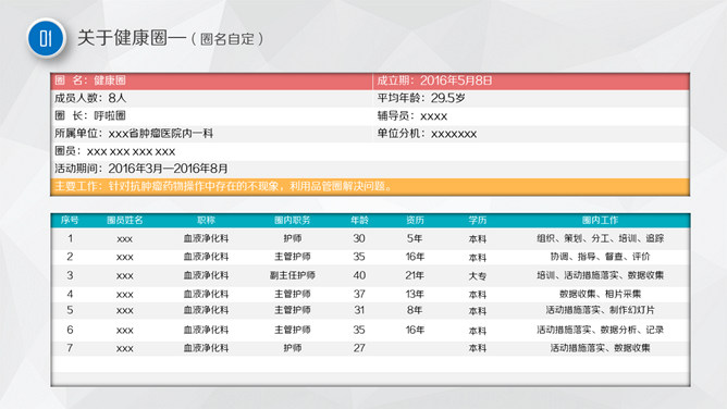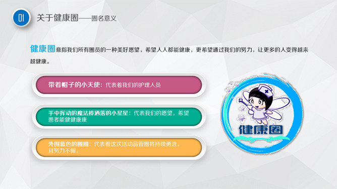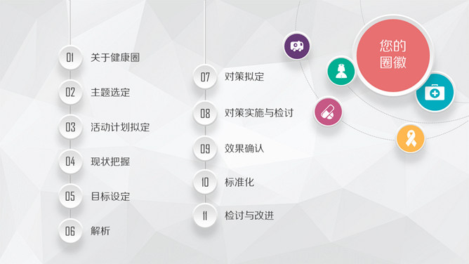 护理品管圈主题汇报PPT模板。目录:关于健康圈、主题选定、活动计划拟定、现状把握、目标设定、解析、对策拟定、对策实施与检讨、效果确认、标准化、检讨与改进。