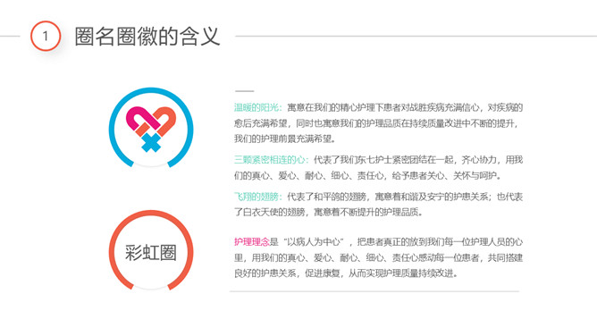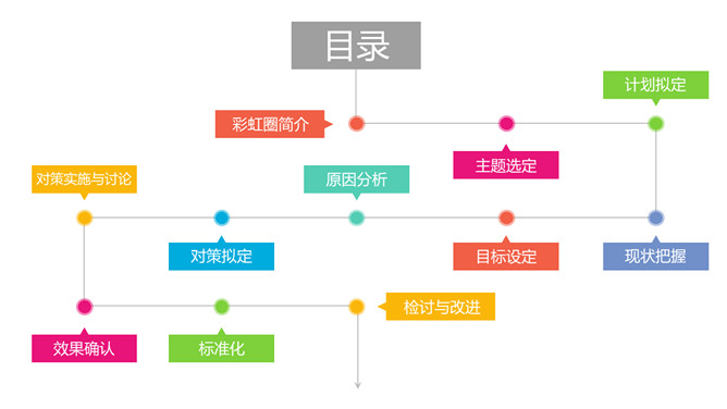 医院品管圈QCC成果汇报PPT模板。目录:彩虹圈简介、主题选定、计划拟定、现状把握、目标设定、原因分析、对策拟定、对策实施与讨论、效果确认、标准化、检讨与改进。