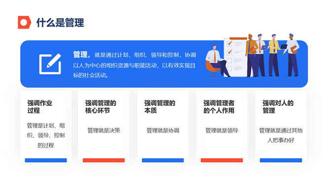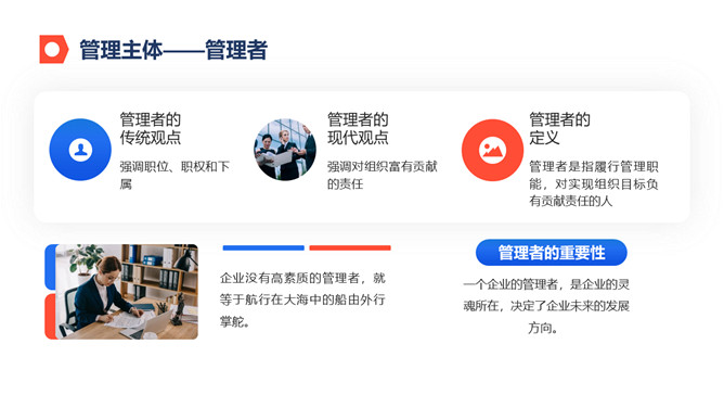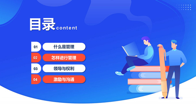 公司企业管理培训PPT模板。包括什么是管理、怎样进行管理、领导与权利、激励与沟通等内容。