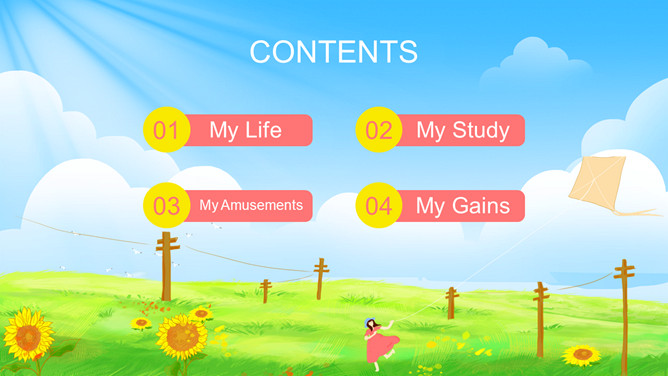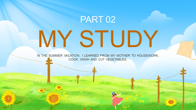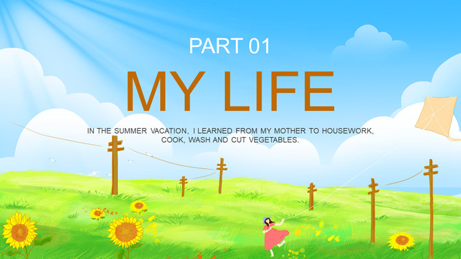 英文版我的暑假生活PPT模板。一套英语版的暑假生活幻灯片模板,清新蓝天白云草地放风筝的小女孩背景。