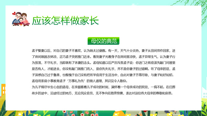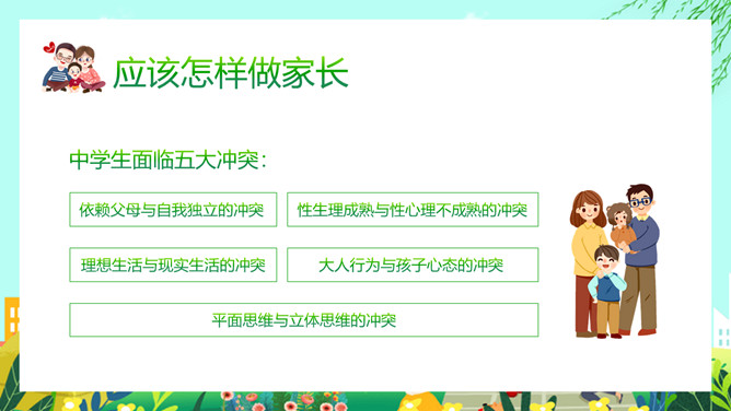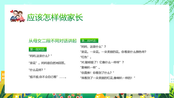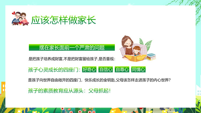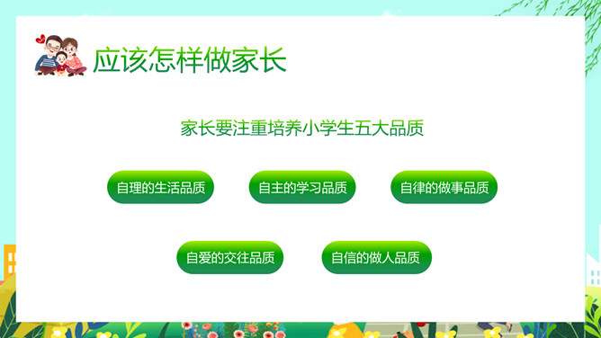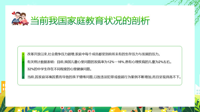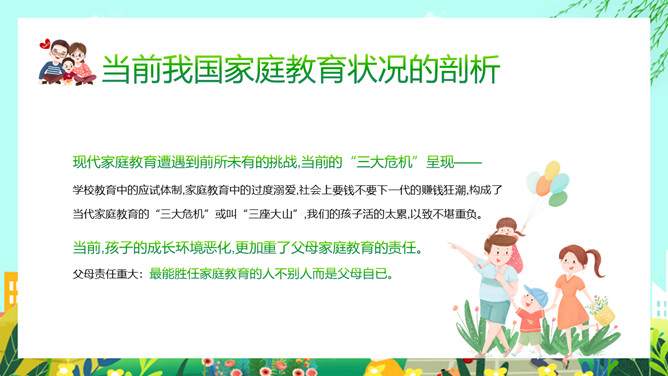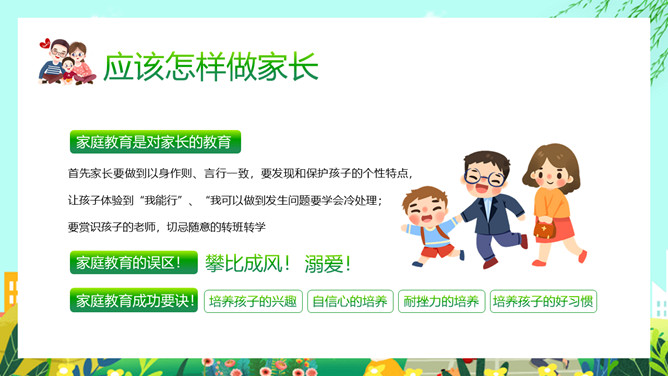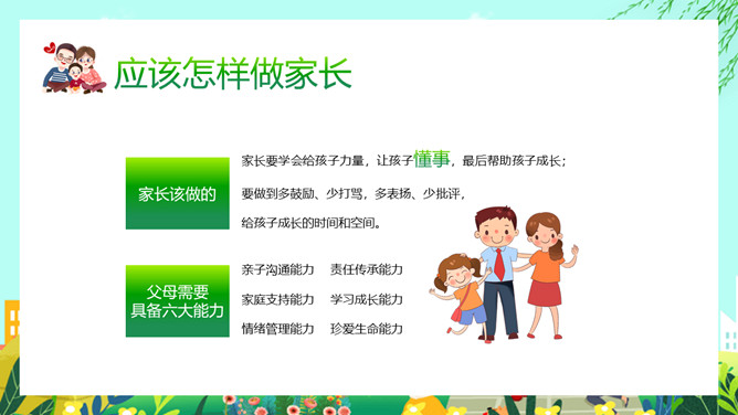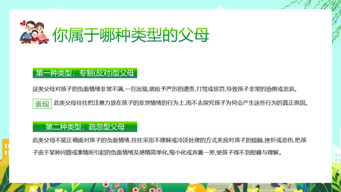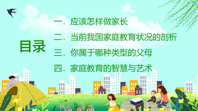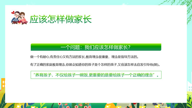 国际家庭日家庭教育培训PPT模板。包括应该怎样做家长、当前我国家庭教育状况的剖析、你属于哪种类型的父母、家庭教育的智慧与艺术。