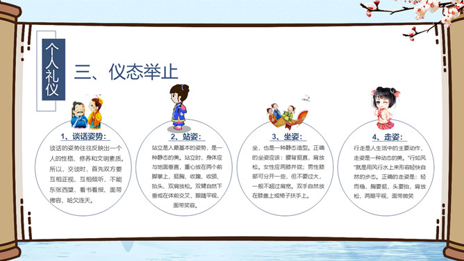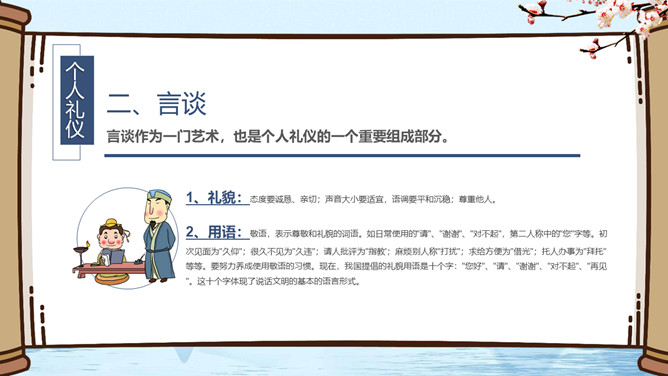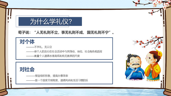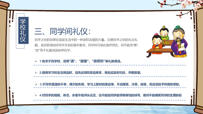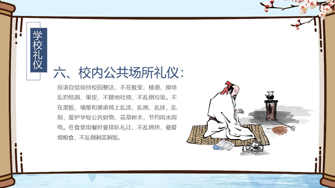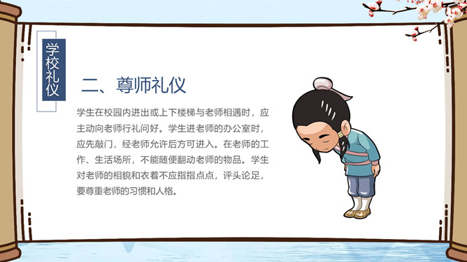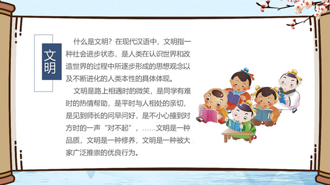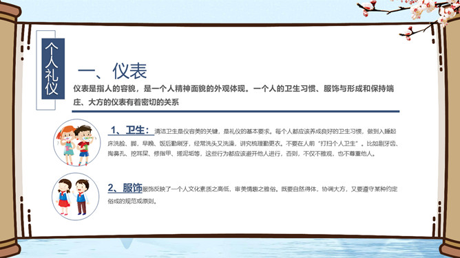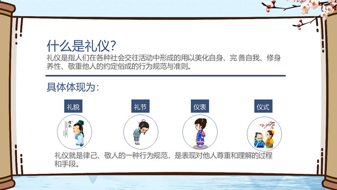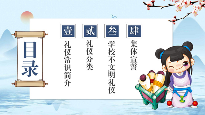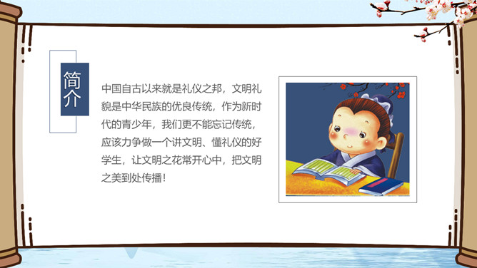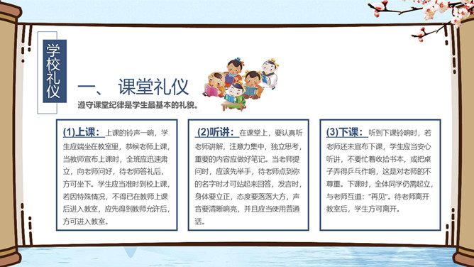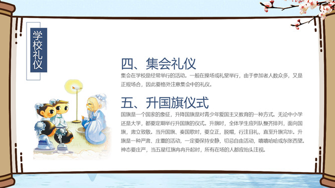 小学生文明礼仪班会PPT模板。一套小学生文明礼仪主题幻灯片模板,包括礼仪常识简介、礼仪分类、学校不文明礼仪、集体宣誓等内容。
