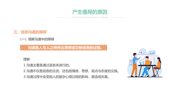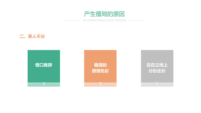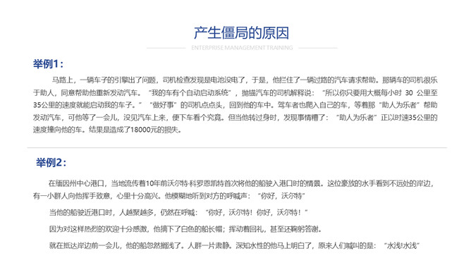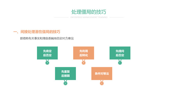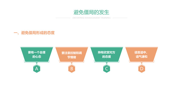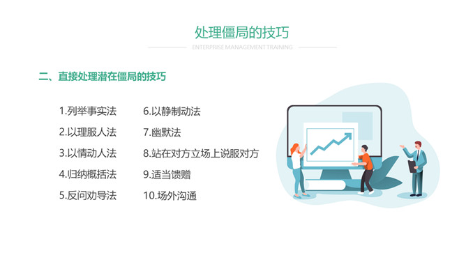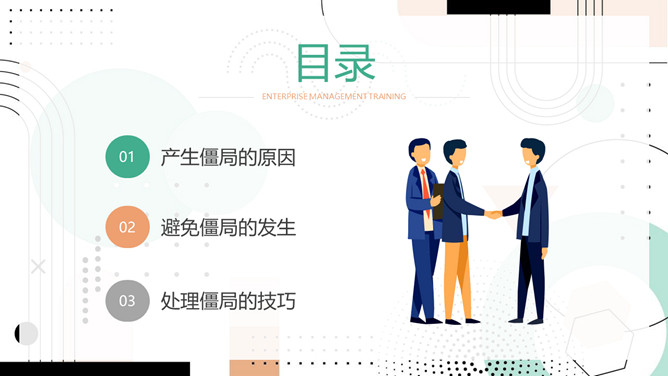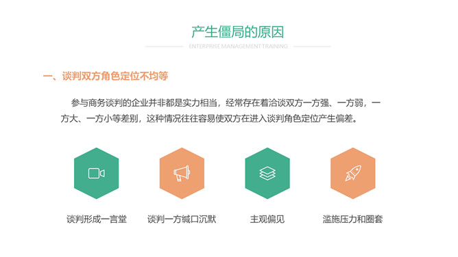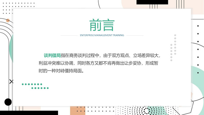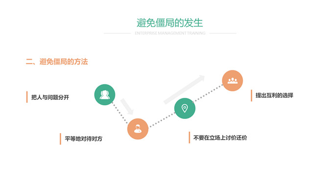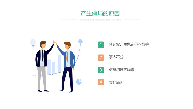 谈判僵局处理技巧PPT课件模板。谈判僵局指在商务谈判过程中,由于双方观点、立场差异较大,利益冲突难以协调,同时各方又都不肯再做出让步妥协,形成暂时的一种对峙僵持局面。