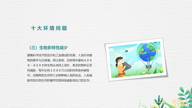 手捧地球世界环境日PPT模板。内容包括世界环境日简介、世界环境问题、破坏环境的行为、环保大家来参与。