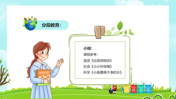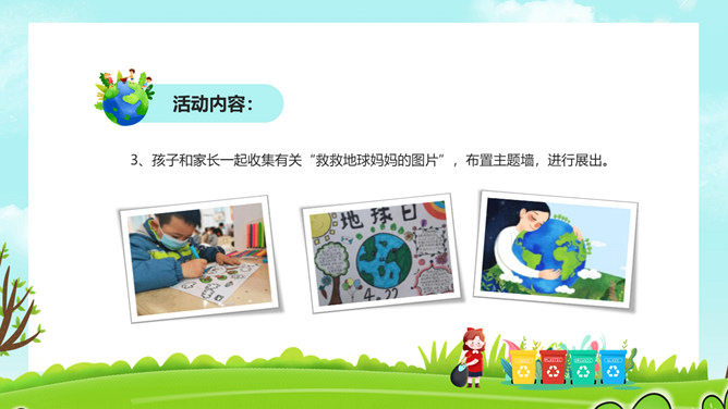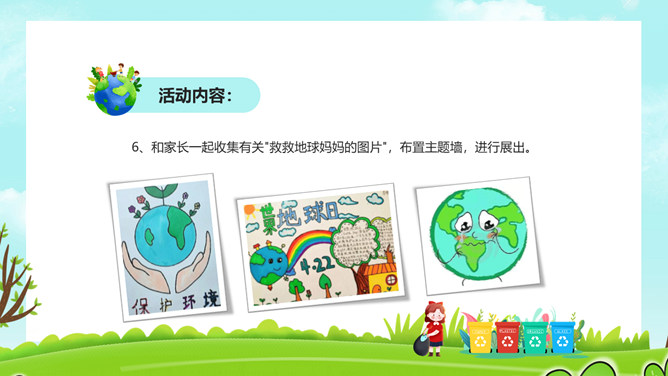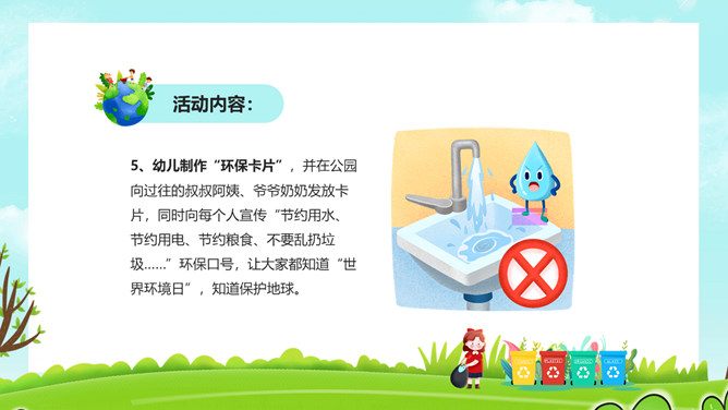 保护环境从我做起PPT模板。一套世界环境日幼儿园小学环境保护宣传模板,草地、蓝天白云背景,卡通风格设计。
