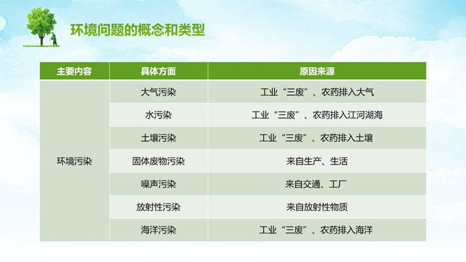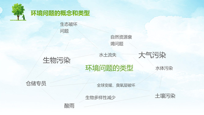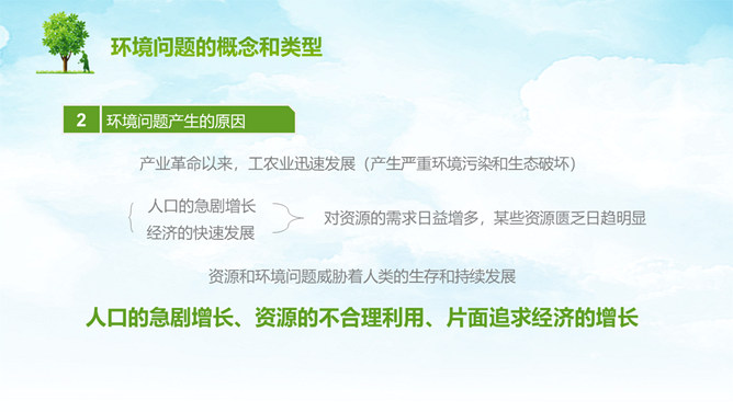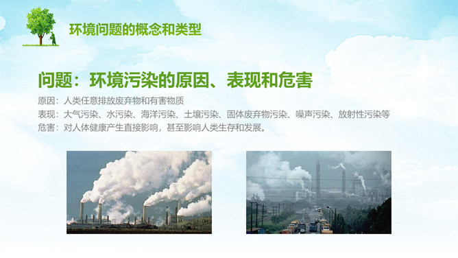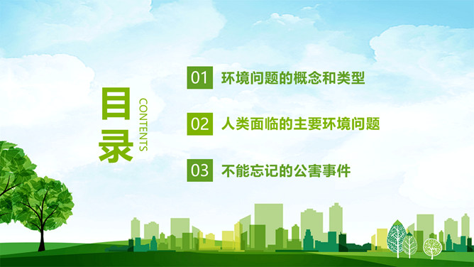 人类面临的环境问题PPT模板。包括环境问题的概念和类型、人类面临的主要环境问题、不能忘记的公害事件等内容。