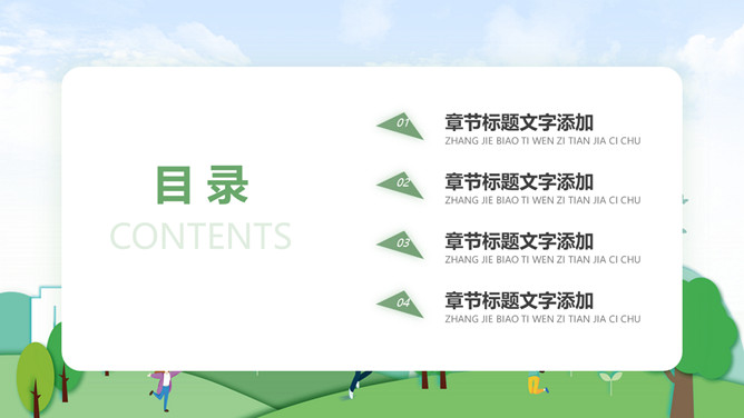 绿色环保节能减排PPT模板。一套环境保护主题模板,蓝天白云、草地大树蝴蝶背景,倡导保护地球,爱护环境。