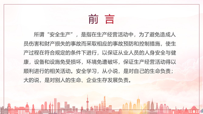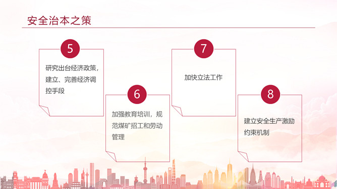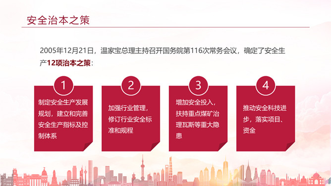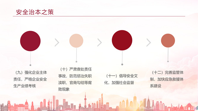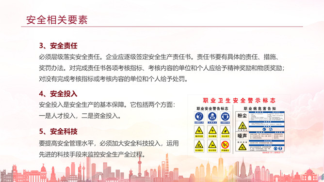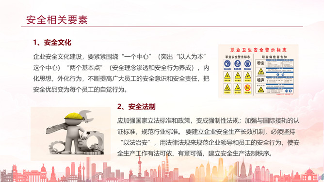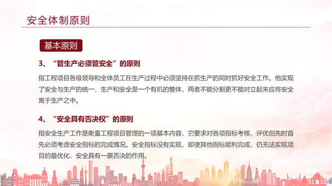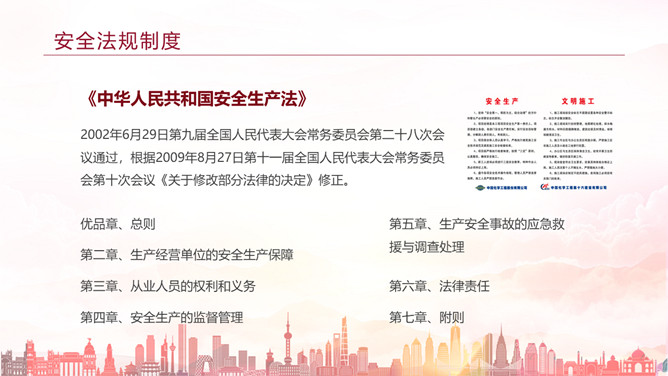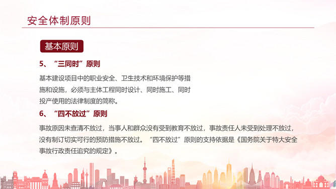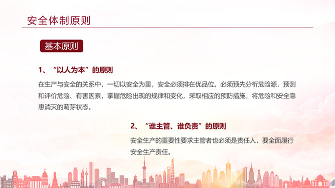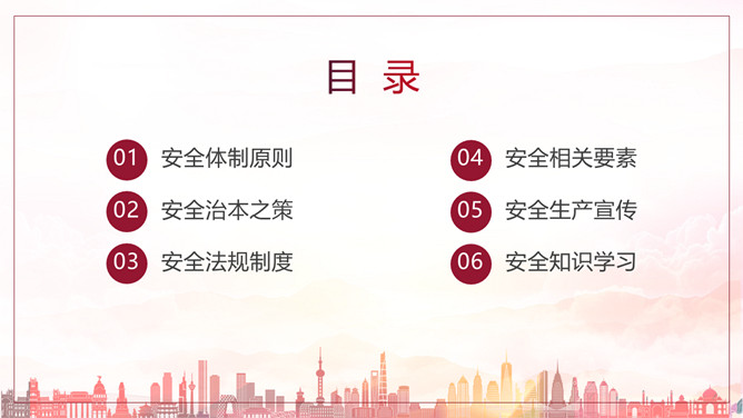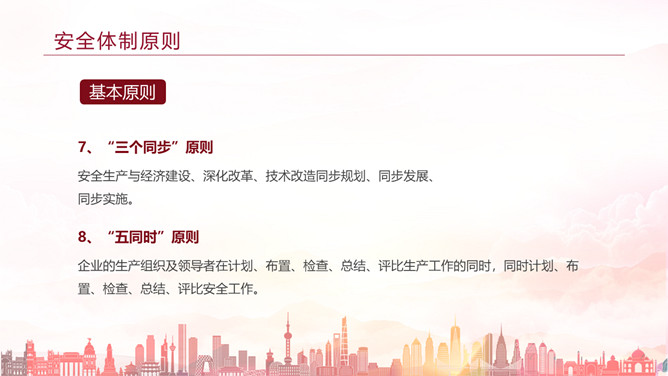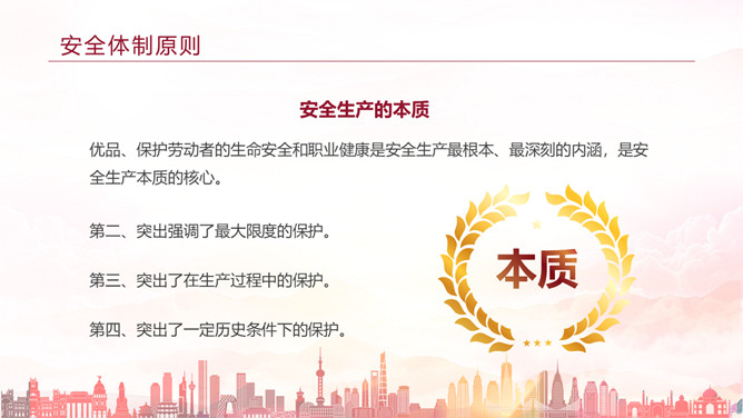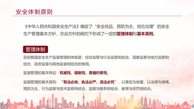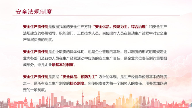 安全生产宣传培训PPT模板。包括安全体制原则、安全治本之策、安全法规制度、安全相关要素、安全生产宣传、安全知识学习。
