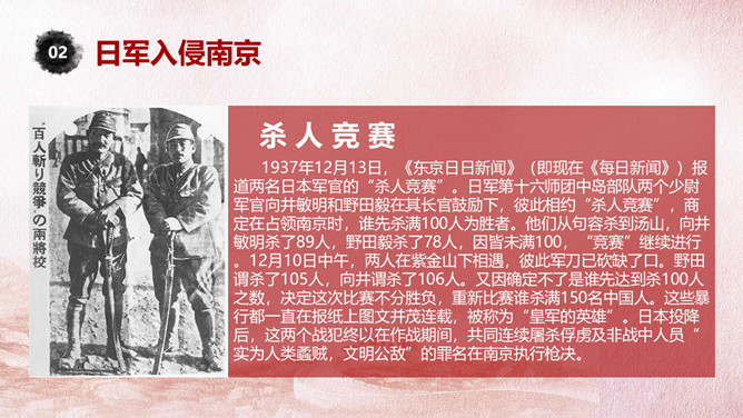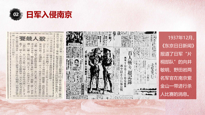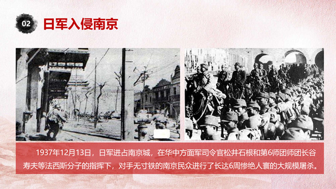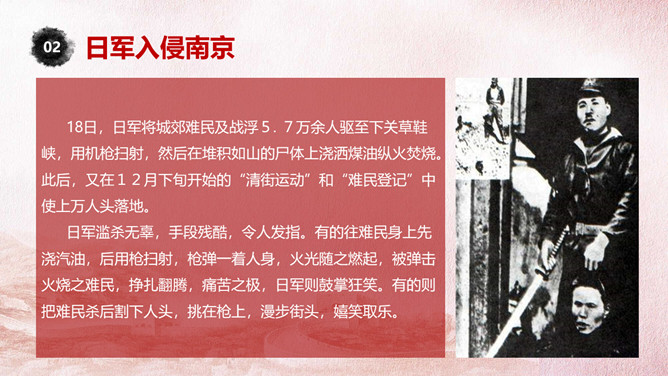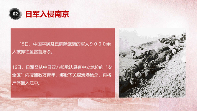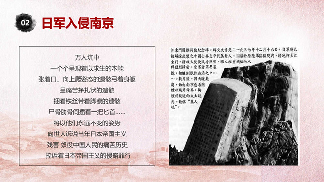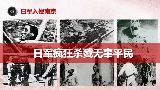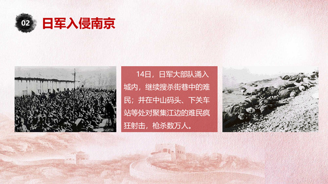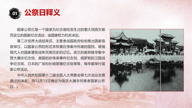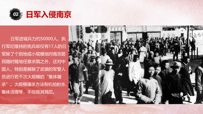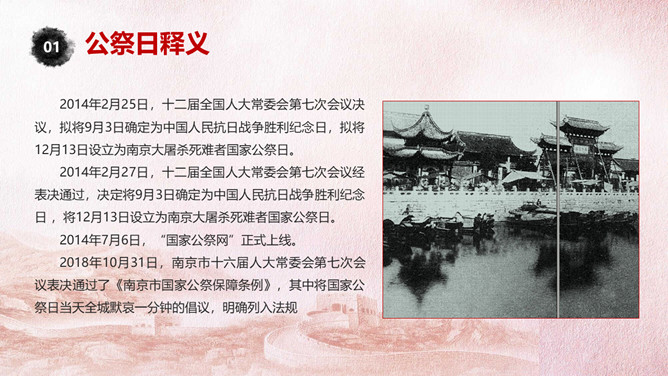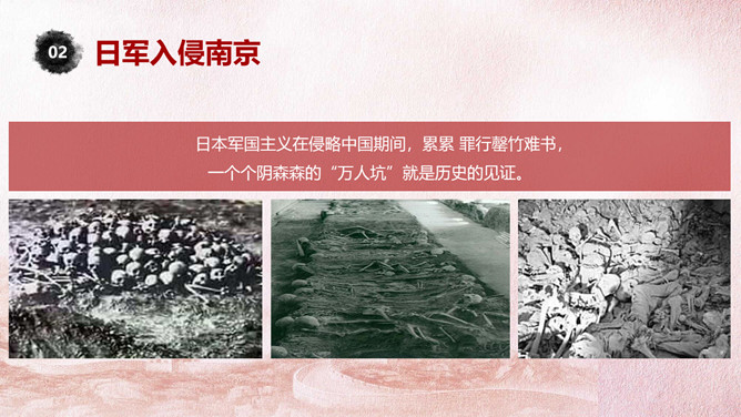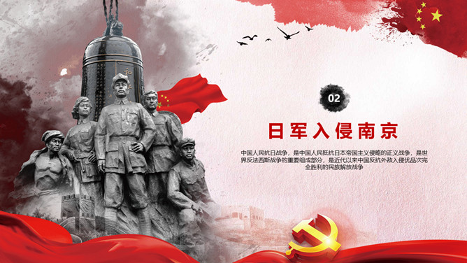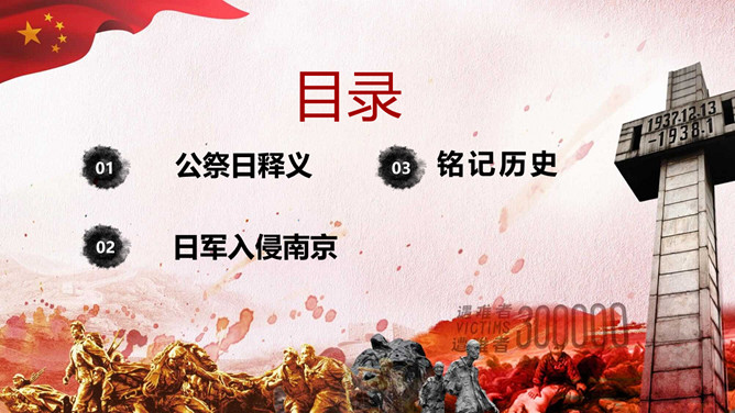 国家公祭日铭记历史PPT模板。一套国家公祭日主题模板,包括公祭日释义、日军入侵南京和铭记历史三部分。
