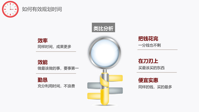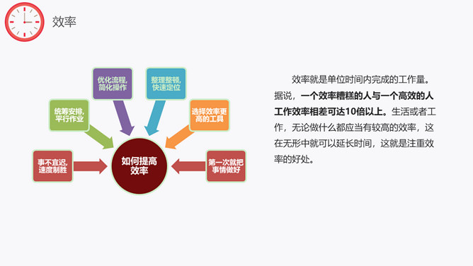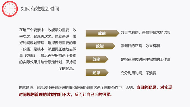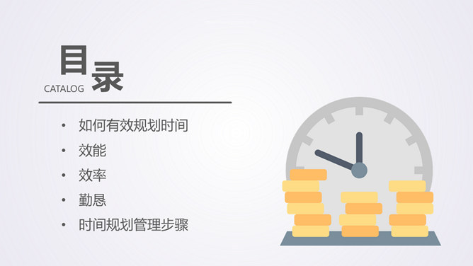 时间规划管理培训课件PPT模板。包括如何有效规划时间、效能、效率、勤恳、时间规划管理步骤等内容。