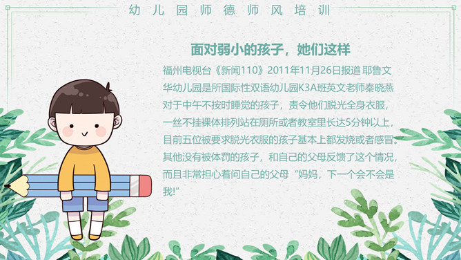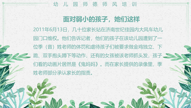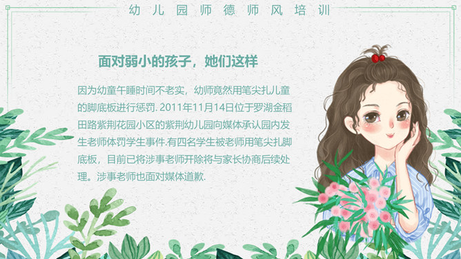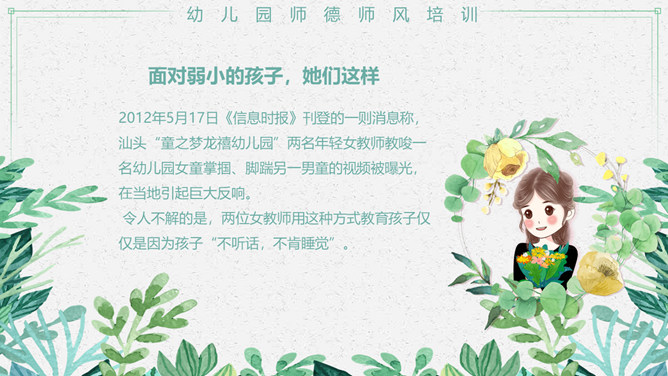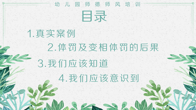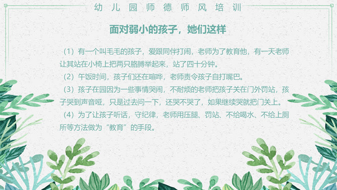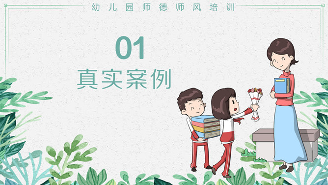 幼儿园师德师风培训PPT模板。包括真实案例、体罚及变相体罚的后果、我们应该知道、我们应该意识到等内容。