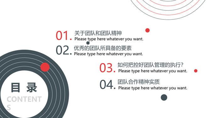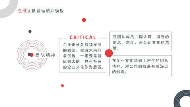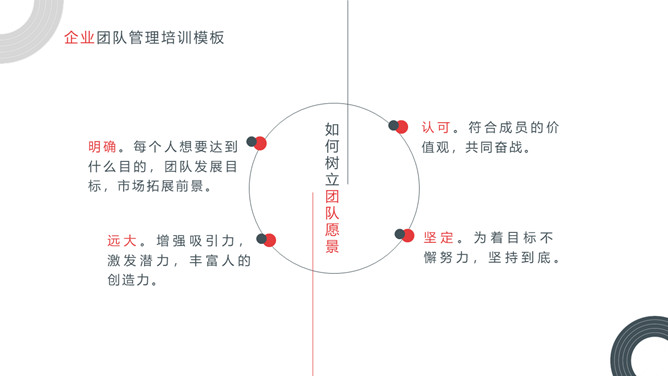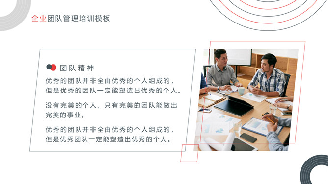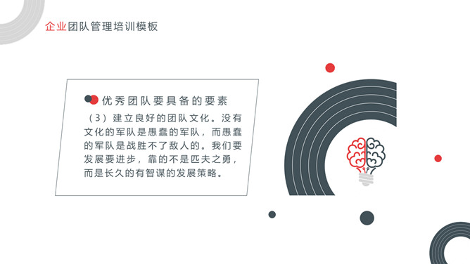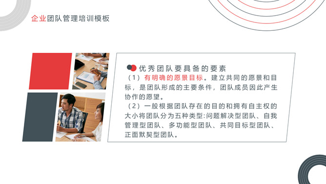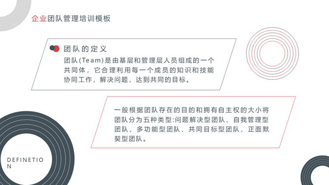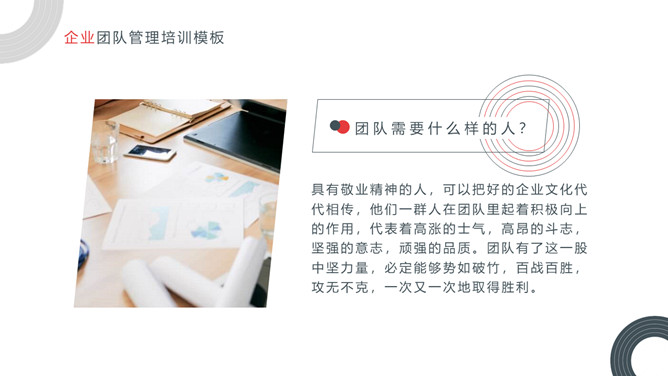 企业团队管理培训课件PPT模板。内容包括关于团队和团队精神、优秀的团队所具备的要素、如何把控好团队管理的执、团队合作精神实质。