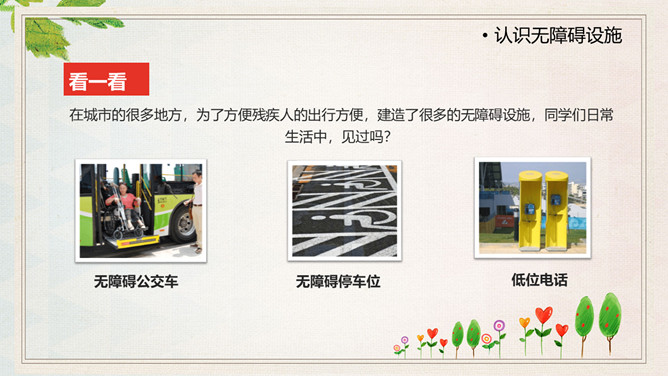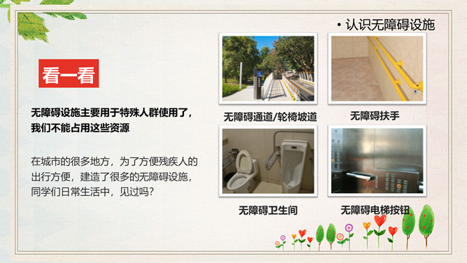 国际残疾人日关爱残疾人PPT模板.包括国际残疾人日介绍、认识无障碍设施、可爱的TA、我们该怎么做?等内容。