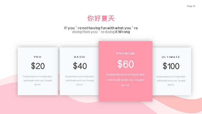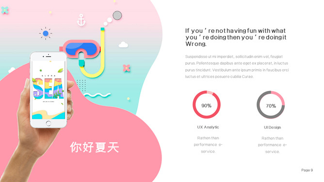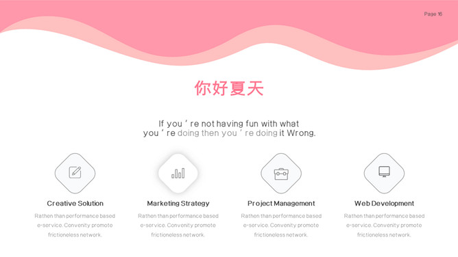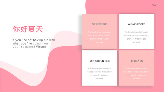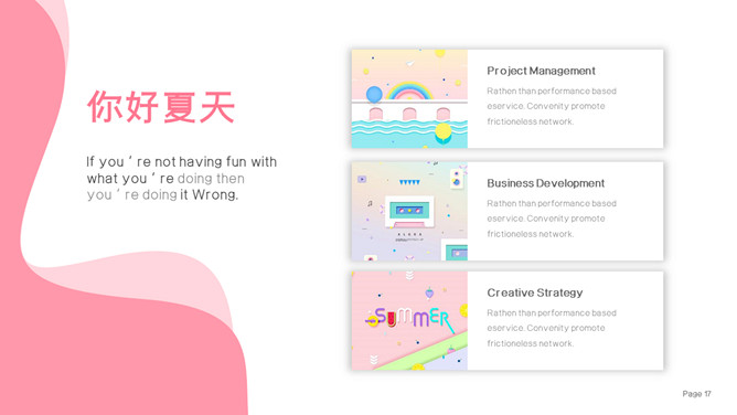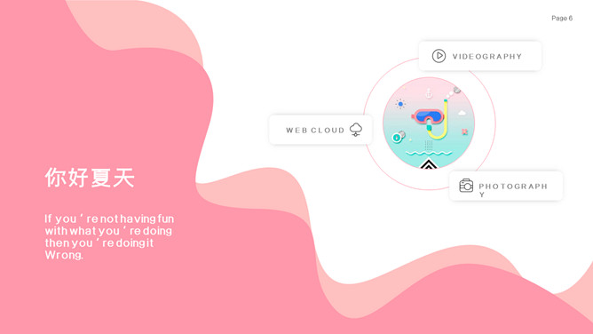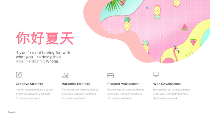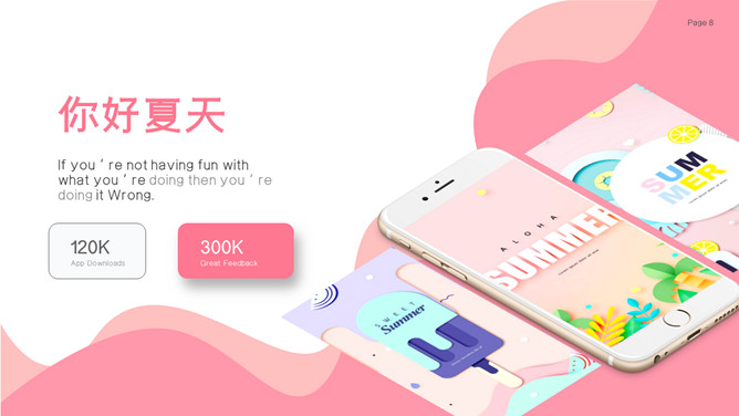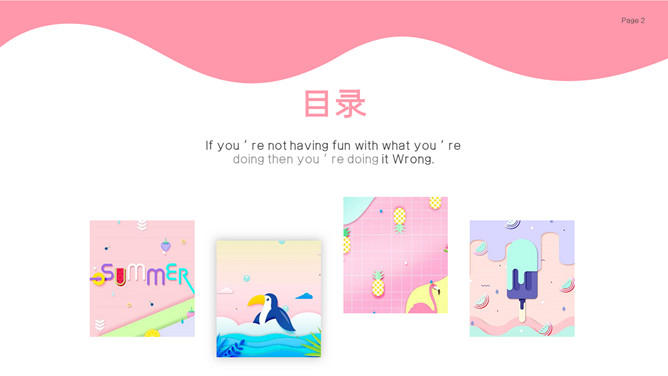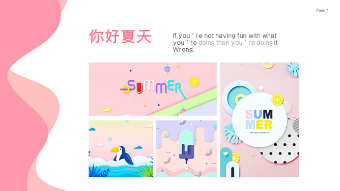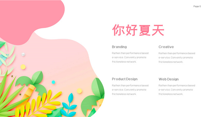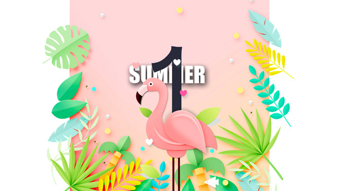 叶子火烈鸟粉色夏天PPT模板。一套夏天主题创意设计模板,粉色主色调,各类叶子装饰背景,火烈鸟主元素。