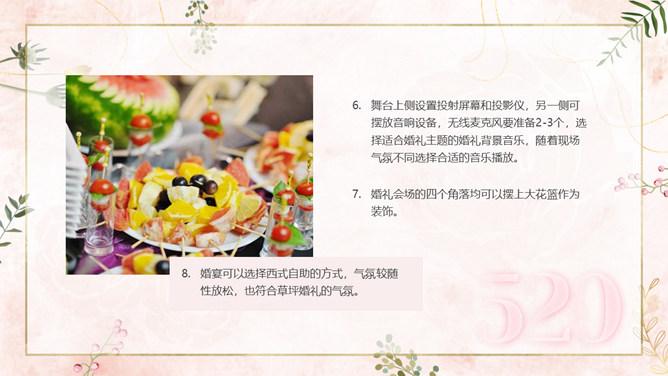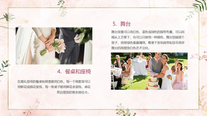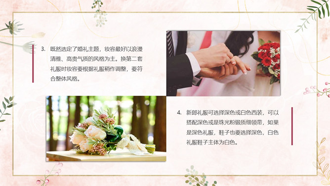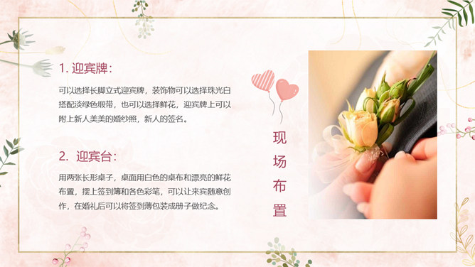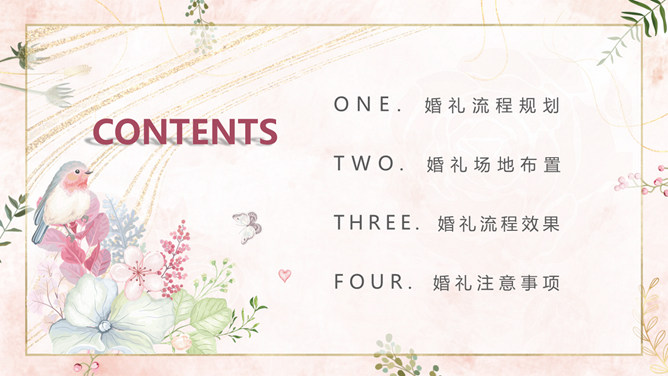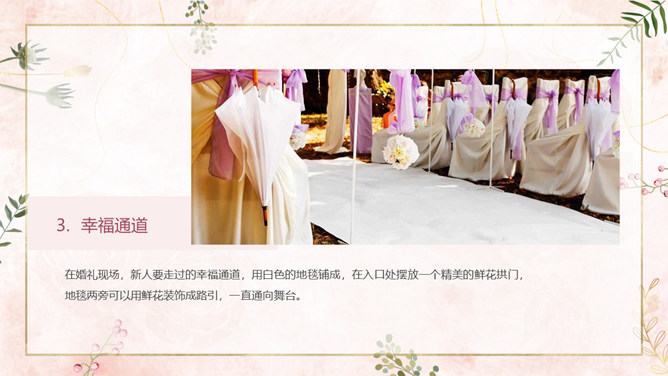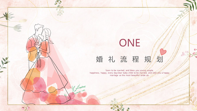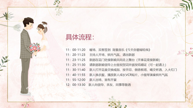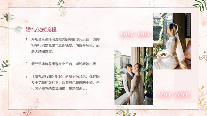 结婚典礼策划方案PPT模板。一套婚礼策划方案模板,浪漫粉色背景,温馨花朵装饰,适合婚礼流程策划等内容。