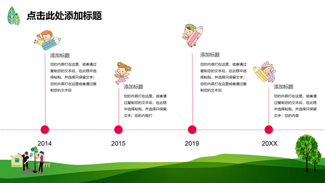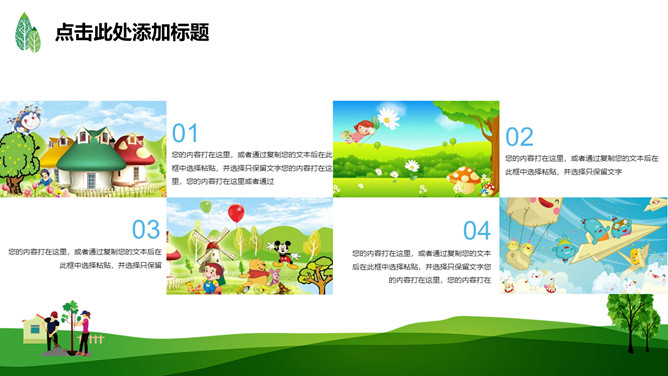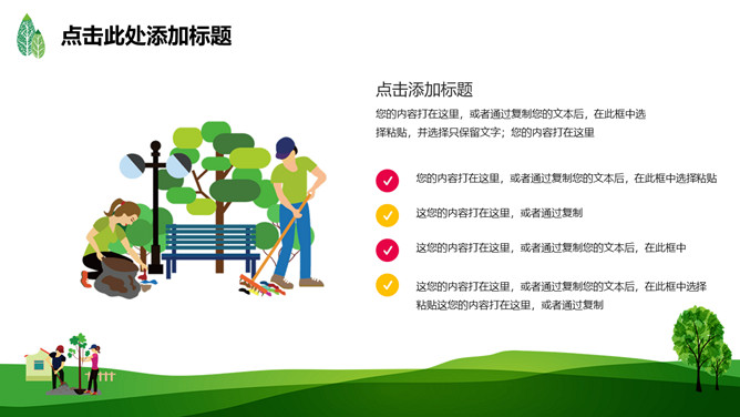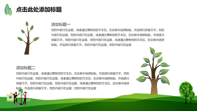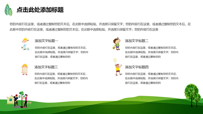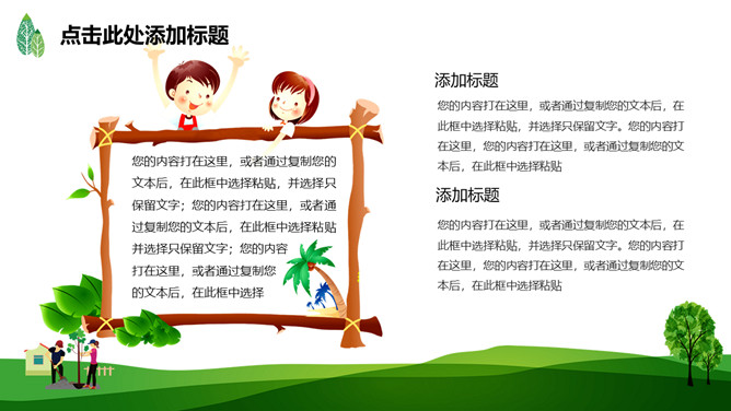 绿树草地3月12日植树节PPT模板。一套植树节主题模板,绿树草地背景,简约清新,适合中小学植树节班会使用。