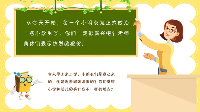 一年级开学迎新班会PPT模板。从今天开始,每一个小朋友就正式成为一名小学生了,你们一定很高兴吧?老师向你们表示热烈的祝贺!