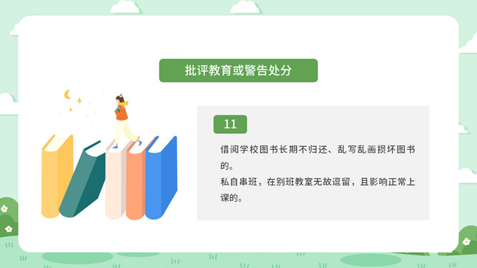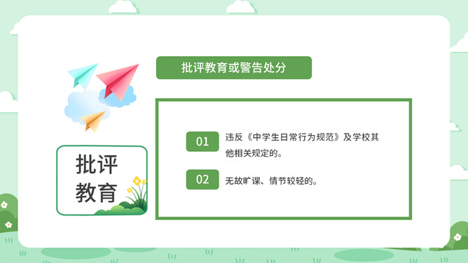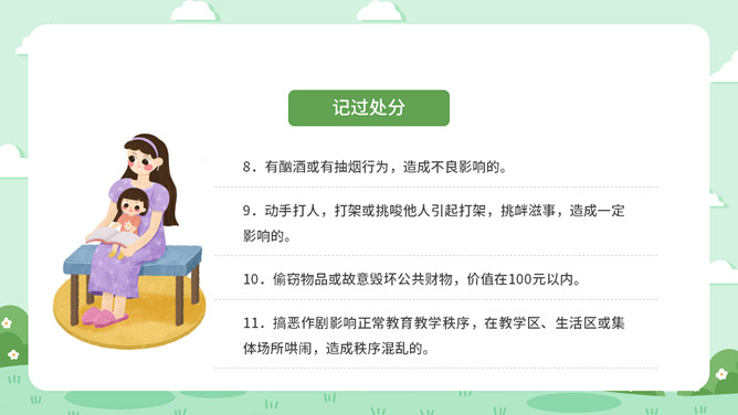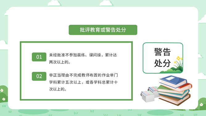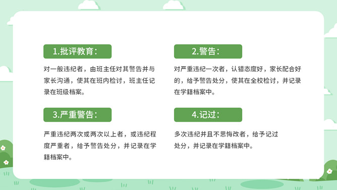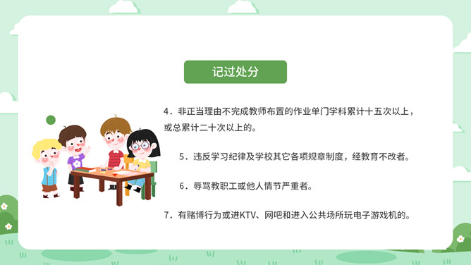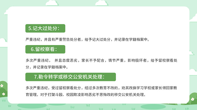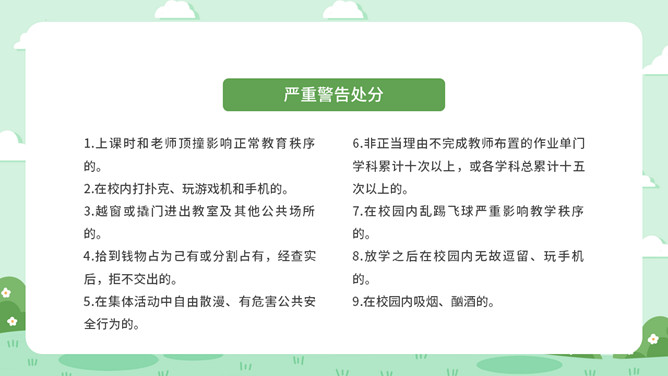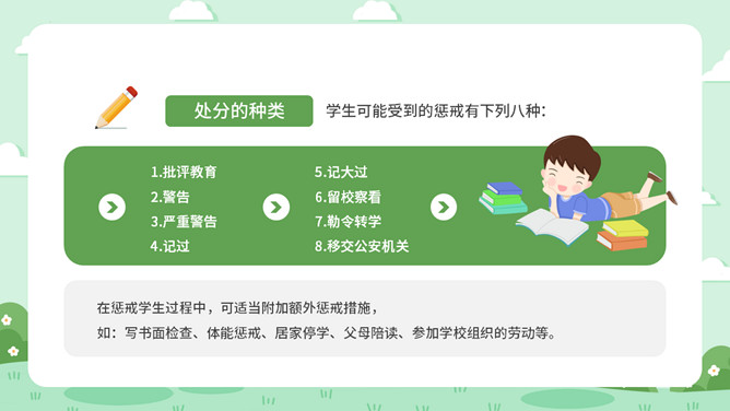 校风校纪整顿主题班会PPT模板。包括处分的种类和运用、违纪行为和处分 、惩戒决定与执行、惩戒撤销等内容。