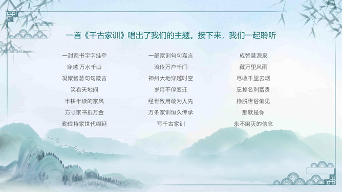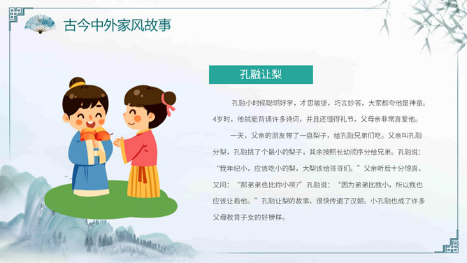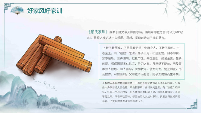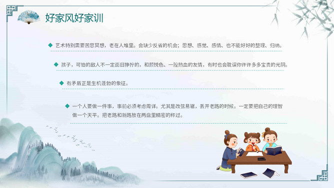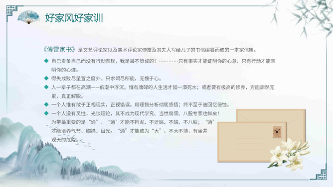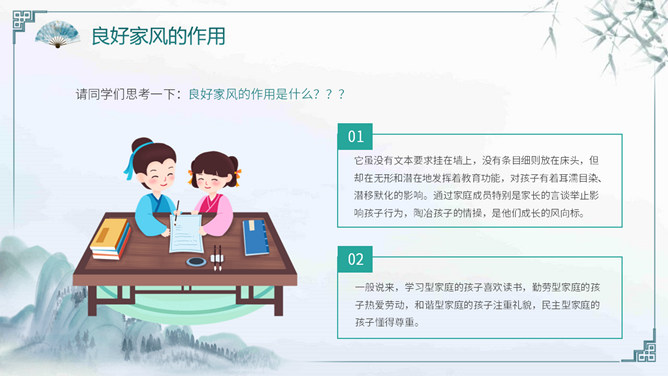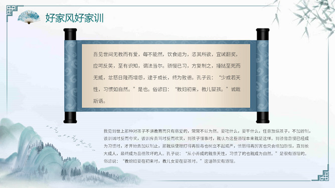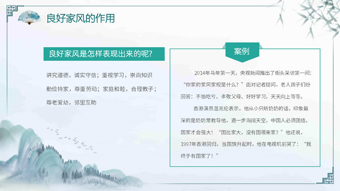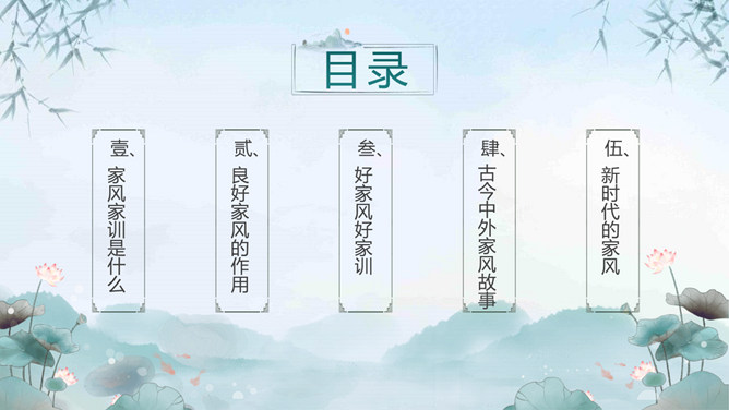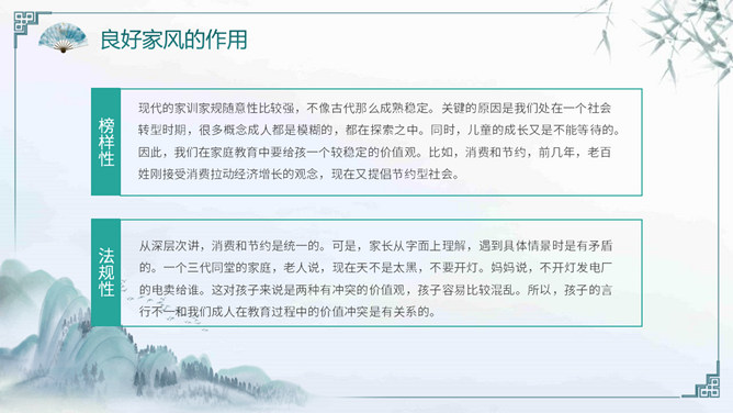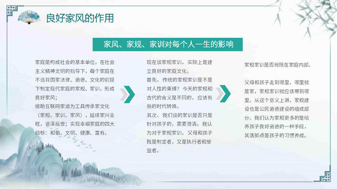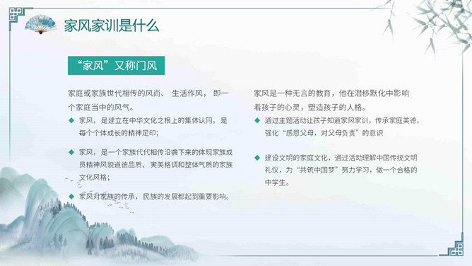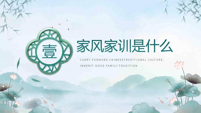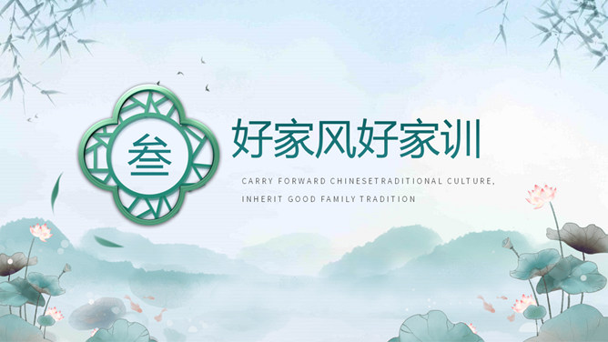 立家法传家训树家风传统美德PPT模板。家风是一种无言的教育,他在潜移默化中影响着孩子的心灵,塑造孩子的人格。