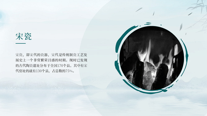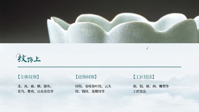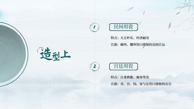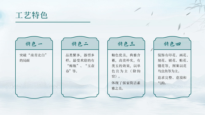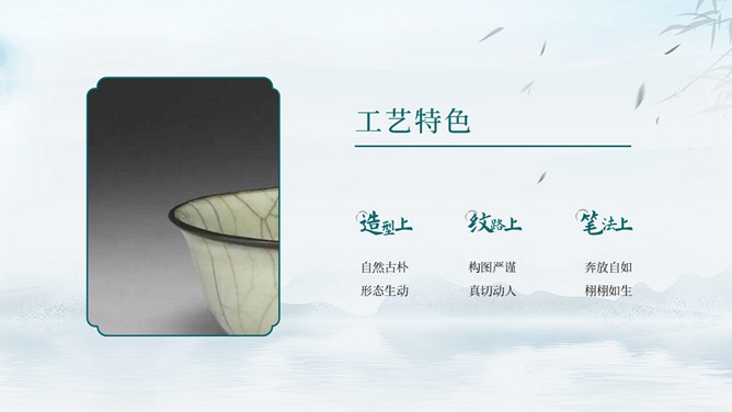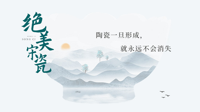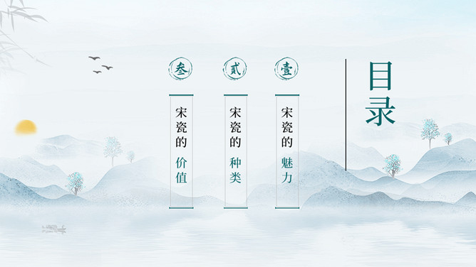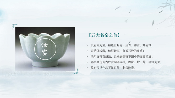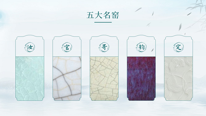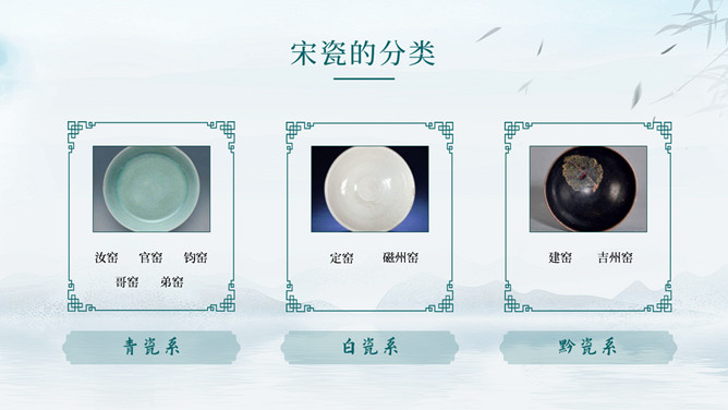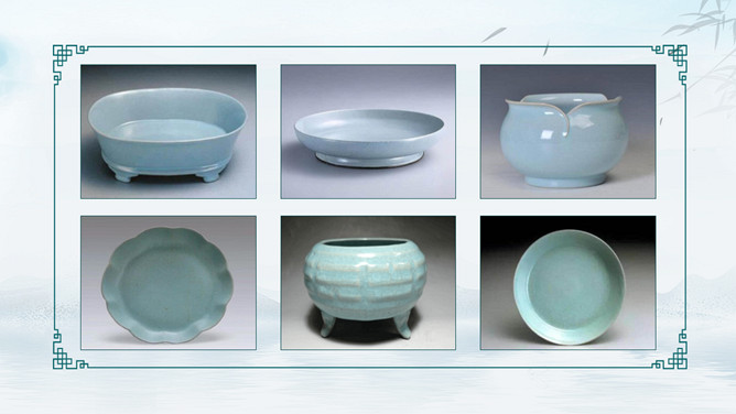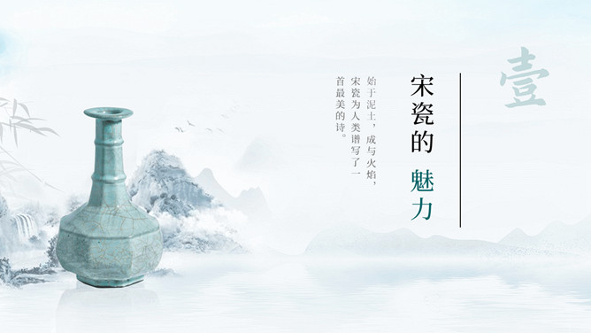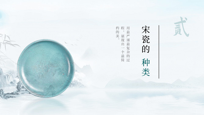 瓷器天青色宋瓷介绍PPT模板。一套宋瓷瓷器介绍模板,淡雅天青色配色,包括宋瓷的魅力、种类和价值等内容。