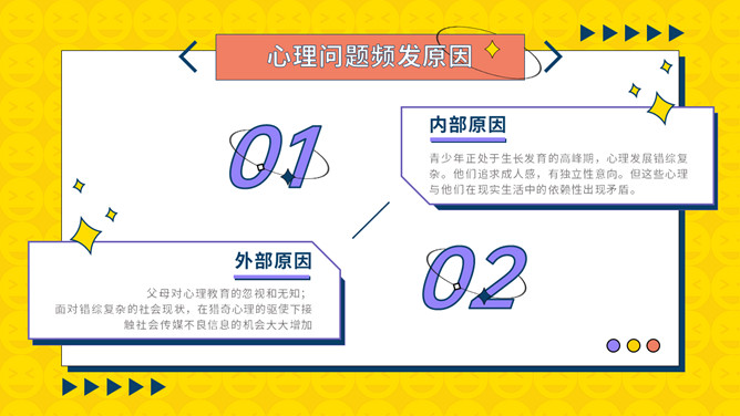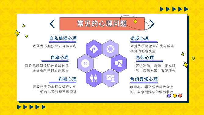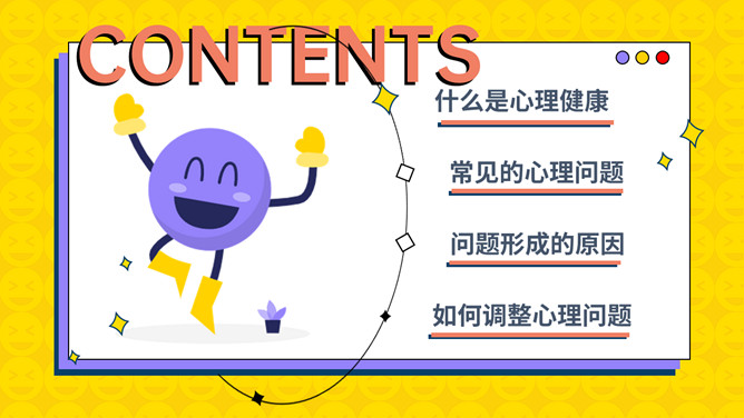 中小学心理健康教育班会PPT模板。内容包括什么是心理健康、常见的心理问题、问题形成的原因、如何调整心理问题。
