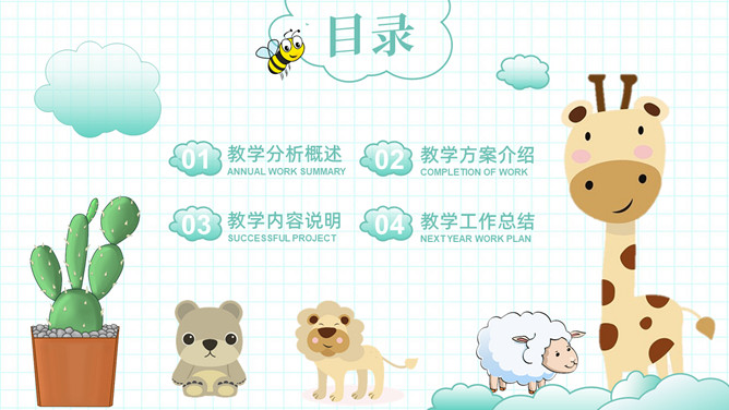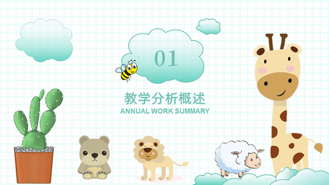 可爱清新卡通动物教学设计PPT模板。一套教师教学设计模板,清新淡绿色配色,可爱卡通小动物装饰。